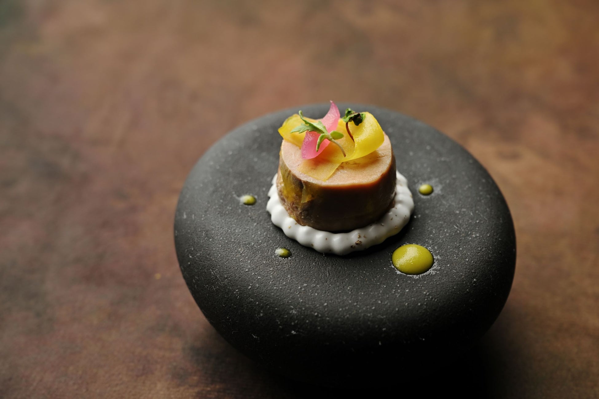伝統的なフレンチの食材フォアグラと和食の技法「粕漬け」の出会い。開幕の一皿にふさわしく、五味五色全てを盛り込みました。