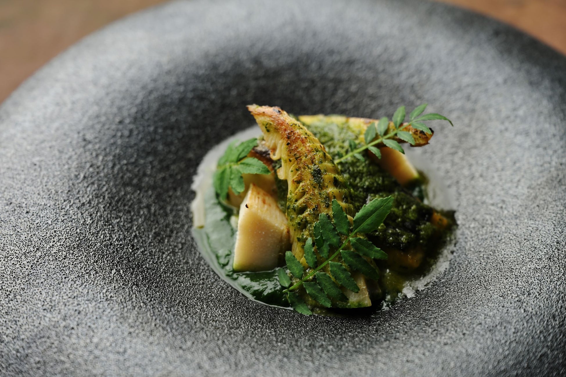皮目をパリッと焼き上げた鰆と塩釜焼の筍をバターと醤油で仕上げました。