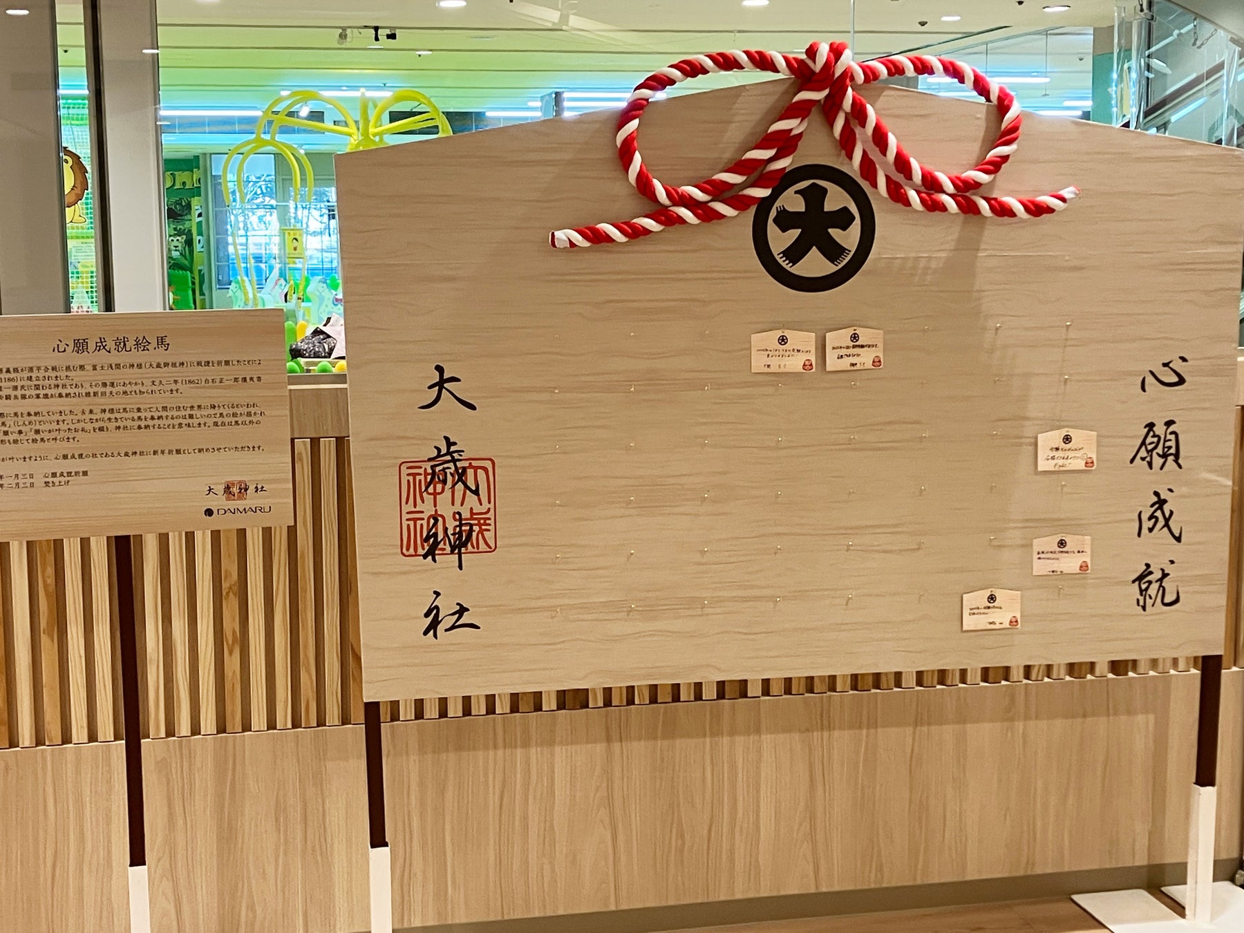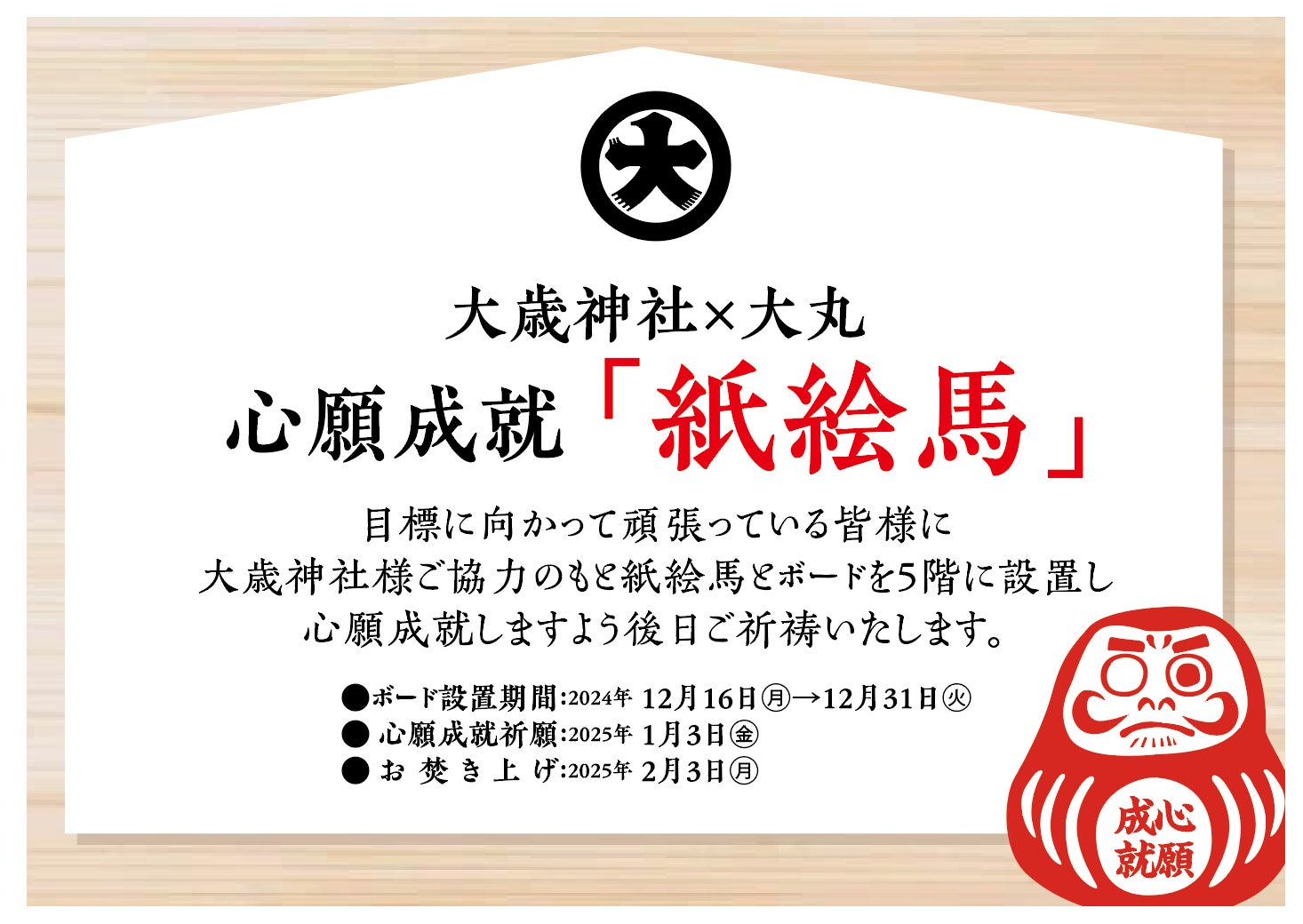 2024年12月16日(月)から12月31日(火)の期間、大丸下関店5階学習スペース「エキスタ」横スペースにおいて、願いを託した紙絵馬と同絵馬が掛けられるボードが設置されています。また、設置終了後、紙絵馬は大歳神社様によって2025年1月3日(金)に心願成就祈願、2月3日(月)にはお焚き上げをいたします。