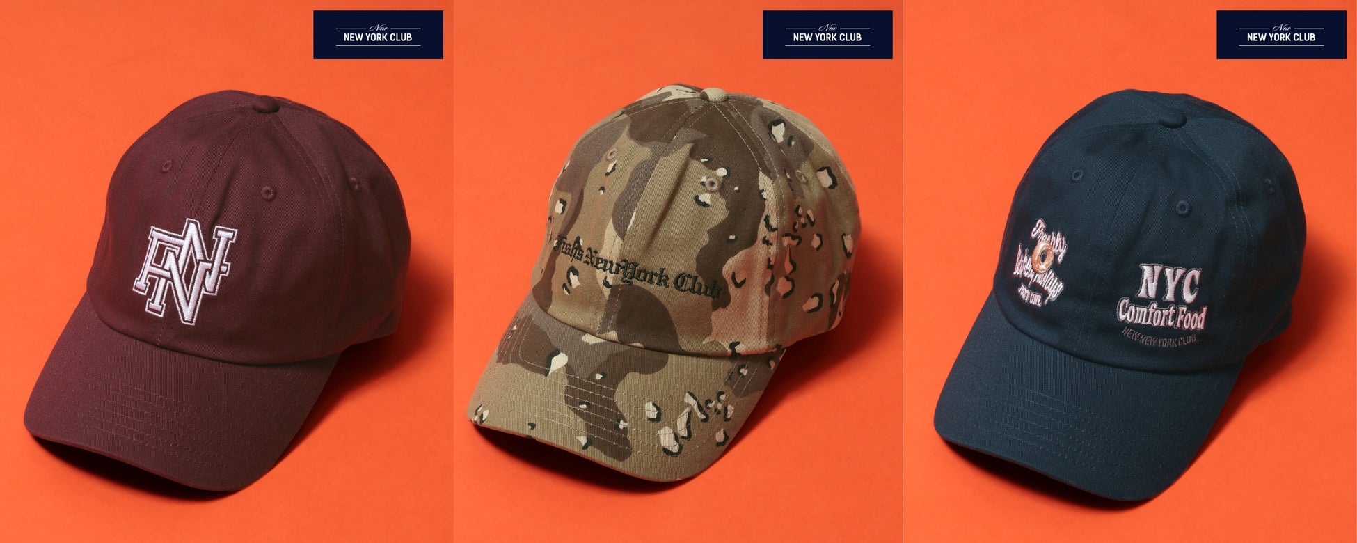 ニューヨークストリートを表現したキャップ。ベーグル、ニューヨークのスカイラインの刺繍が施されているネイビー、ストリート感のあるコラボロゴが施されたカモフラ柄、フロントの大きなワッペンにカレッジ要素を散りばめたボルドーの3色展開です。