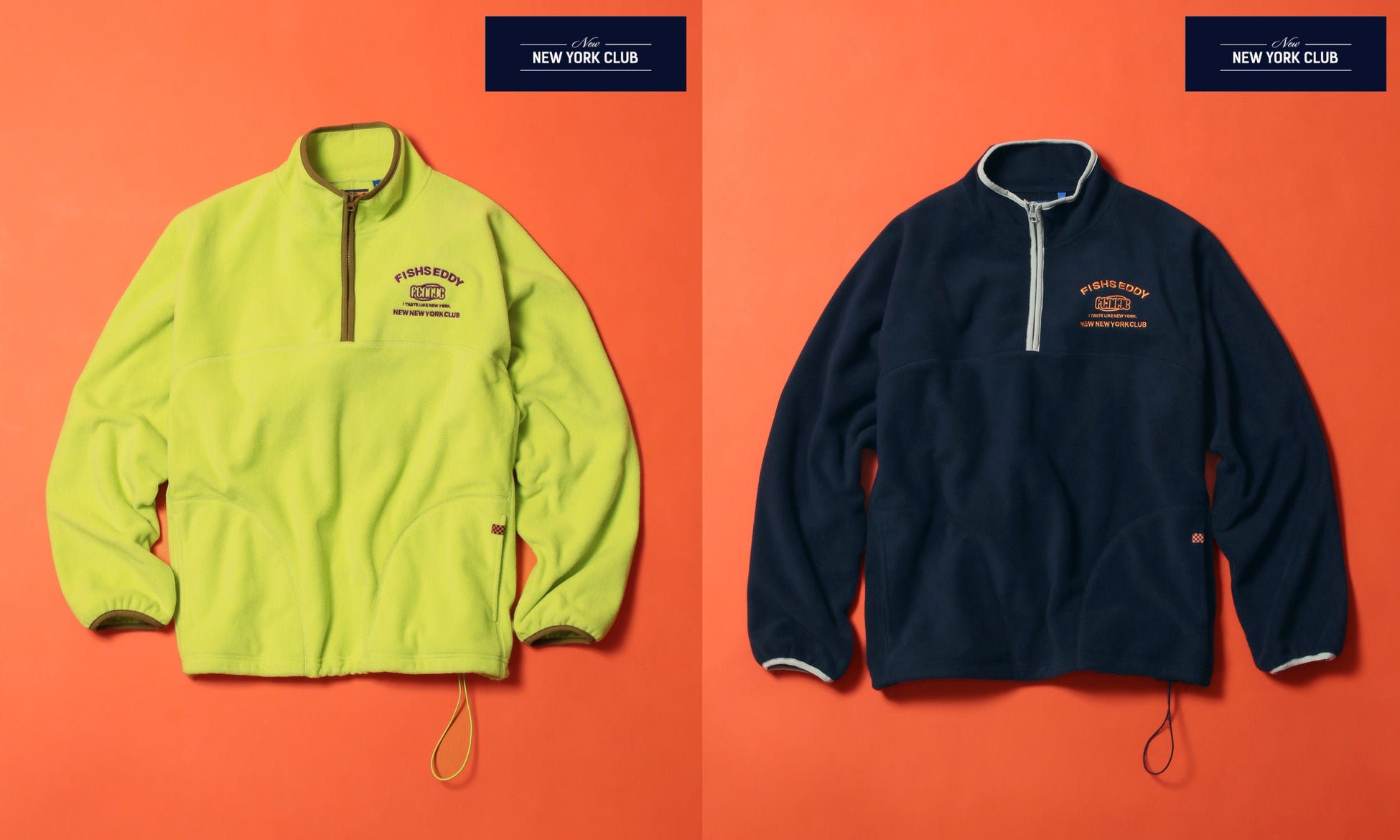 FISHS EDDY NEW NEW YORK CLUBの刺繍ロゴが入ったハーフジップタイプのフリースプルオーバー。鮮やかなライトグリーンとネイビーの二色展開です。ニューヨークをイメージしたオレンジ×ネイビーの織ネームがアクセントになっており、防寒性に優れた一枚です。