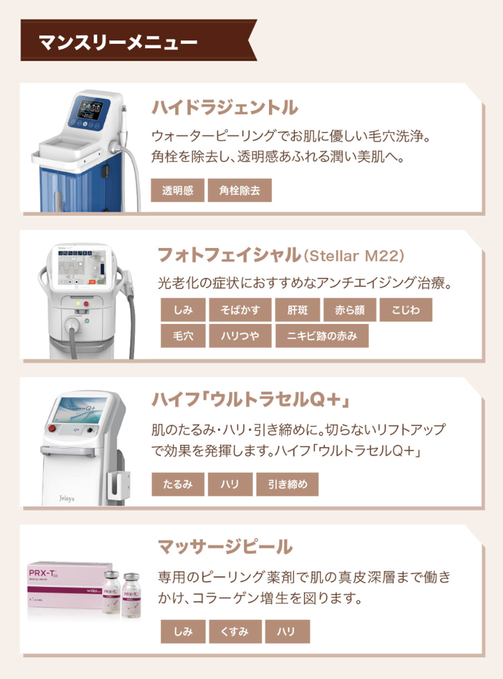 定額料金内で、定期的に、安心して通っていただけるクリニックです。皆さんの「美のかかりつけ医」をめざし、末永く皆さまのお肌に寄り添い、美を磨くお手伝いをさせていただけたらと思います。
