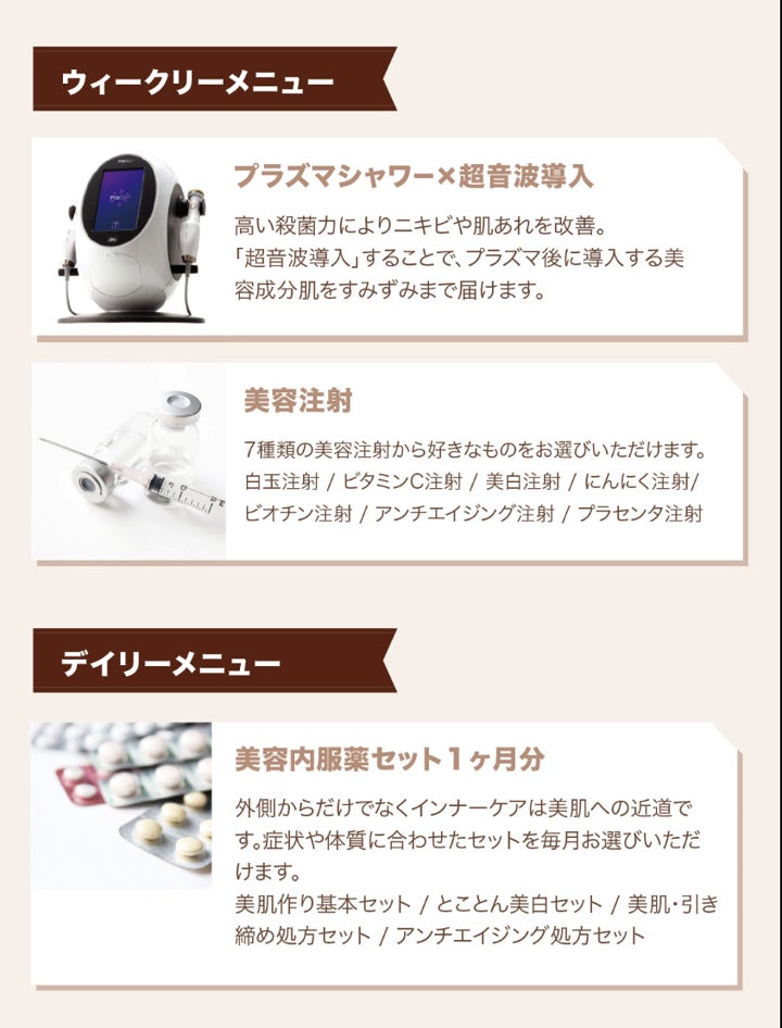 ハイフやピーリングなどの美容医療施術や美容注射、ご自身で行うプラズマシャワー×超音波導入、さらには毎日のインナーケアのための美肌内服薬セットも含め、定額料金内で高コスパでご提供する、新時代のスキンケアクリニックです。医師によるオンライン診療や通常時のご予約は、専用アプリケーションで簡単にご利用いただけます。