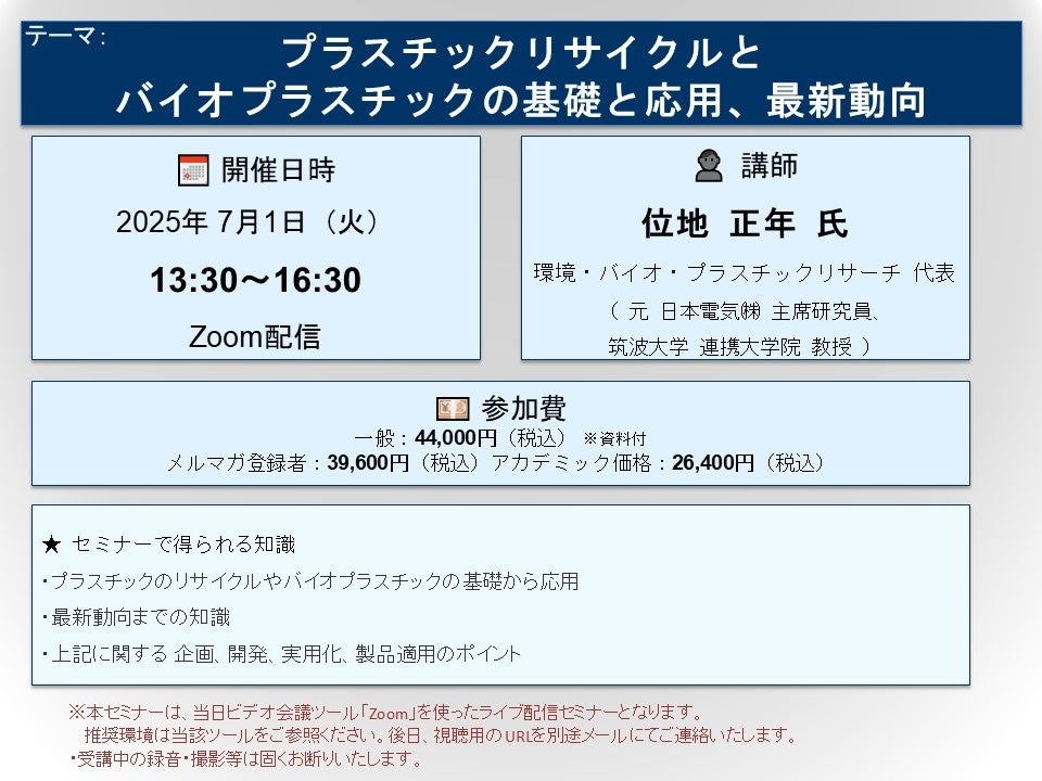 先端技術情報や市場情報を提供している(株)シーエムシー・リサーチ(千代田区神田錦町: https://cmcre.com/ )では、 各種材料・化学品などの市場動向・技術動向のセミナーや書籍発行を行っておりますが、 このたび「プラスチックリサイクルとバイオプラスチックの基礎と応用、最新動向」と題するセミナーを、 講師に位地 正年 氏(環境・バイオ・プラスチックリサーチ 代表( 元 日本電気㈱ 主席研究員、 筑波大学 連携大学院 教授))をお迎えし、2025年7月1日(火)13:30より、 ZOOMを利用したライブ配信で開催いたします。 受講料は、 一般:44,000円(税込)、 弊社メルマガ会員:39,600円(税込)、 アカデミック価格は26,400円(税込)となっております(資料付)。