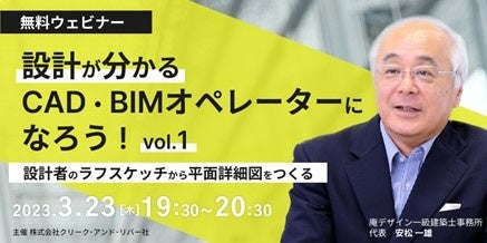 株式会社クリーク・アンド・リバー社(C&R社)は3月23日(木)、建築CAD・BIMオペレーターの皆さまを対象に、無料のオンラインセミナー「設計が分かるCAD・BIMオペレーターになろう!vol.1 ~設計者のラフスケッチから平面詳細図をつくる~」を開催いたします。