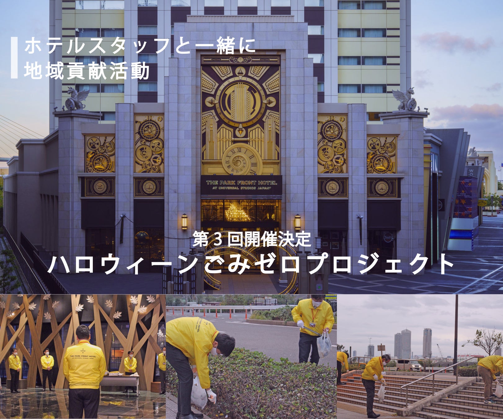 本プランでご予約いただいたお客様には11月1日(水)早朝に、ザ パーク フロント ホテル アット ユニバーサル・スタジオ・ジャパンのホテルスタッフと共に、ハロウィーン翌日のユニバーサルシティ駅周辺の清掃活動にご参加いただきます。当日は、パーク フロント ホテルのスタッフジャンパーに身を通し、約30分間のゴミ拾いに参加し、環境と地域に優しい活動を推進します。
