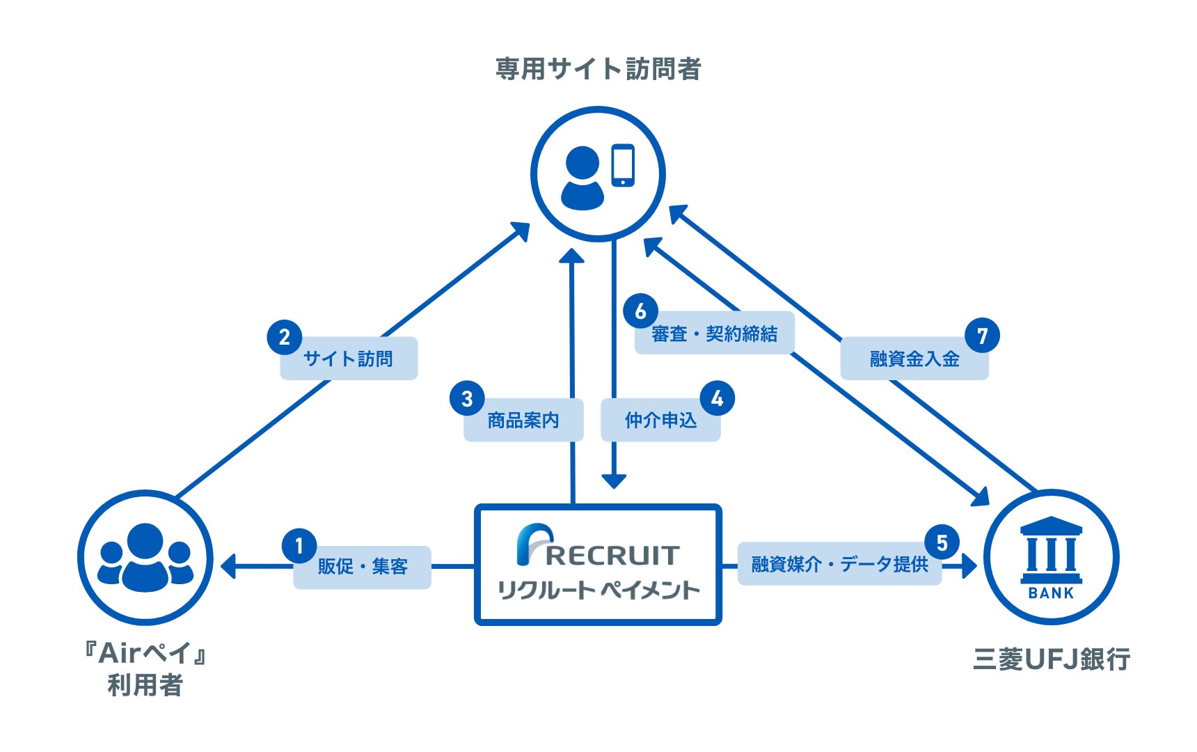リクルートペイメントは、資金調達をしたい中小事業者と三菱UFJ銀行をマッチングする専用Webサイトを構築し、三菱UFJ銀行と共同で検証を開始します。リクルートペイメントは、リクルートが保有する『Airペイ』の利用状況から独自の基準を設けて中小事業者を専用Webサイトに招待し、事業性融資を仲介します。融資契約は、三菱UFJ銀行と中小事業者の間で直接締結します。