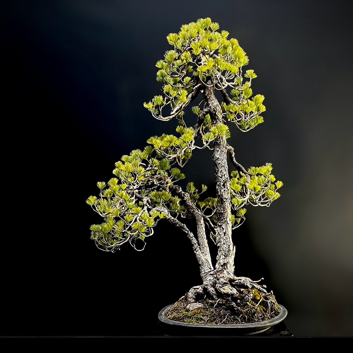 樹齢約80年。著名愛好家旧蔵の三幹文人木の五葉松。しっかり落ちた枝に自然な枝配りからくる古作ならではの洒脱な雰囲気です。