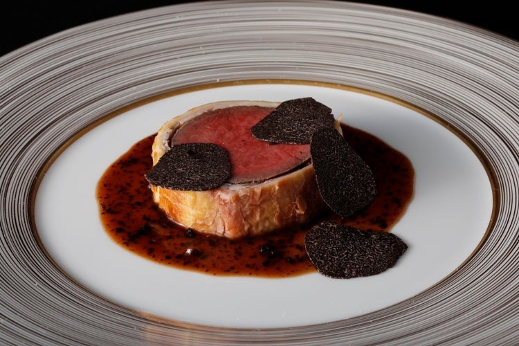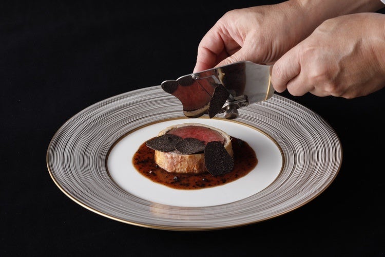 『尾崎牛のウェリントン風 ペリグーソース』は、シンプルでありながら贅沢な食材を組み合わせた究極の一皿。じっくりと焼き上げられ、中心部を美しいロゼ色に仕上げたジューシーで柔らかい尾崎牛フィレ肉に、香り豊かなマッシュルームデュクセルを丁寧に塗り、パイ生地で包み込みました。口当たりは軽やかでサクサクに焼き上げられたパイ生地、内側にあるビーフ、デュクセルの風味と絶妙にマッチするトリュフをふんだんに使用した「ペリグーソース」。三位一体の味をぜひご堪能ください。
