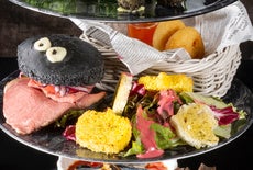 竹炭を使った真っ黒なバンズと舌に見立てたローストビーフが飛び出るハロウィンバーガーや不気味な笑みを浮かべるミートパイ、そして開けてみないと何が入っているかわからないドキドキ感満載のベールに包まれたトルティーヤロールなど目で見てもお楽しみいただける内容となっております。