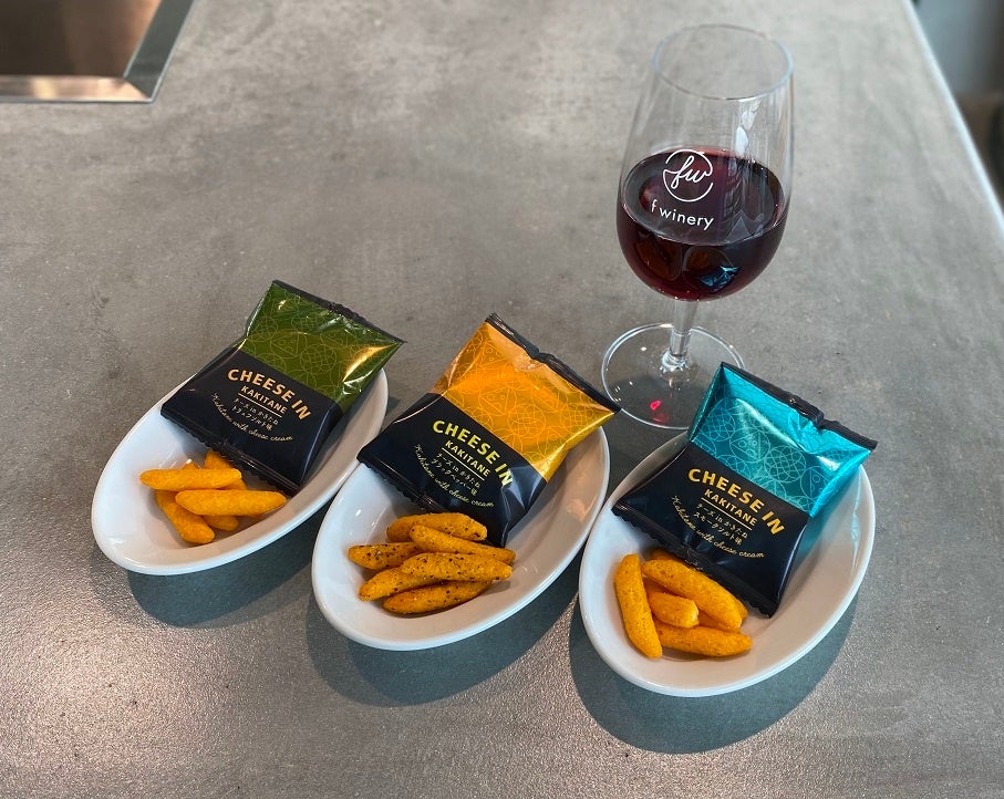 f wineryは、実験的なワインづくり(醸造)のほか、ワインをさまざまなスタイルで楽しむこともご提案しています。ありきたりでない、ワインをカジュアルに楽しめるスナックの新企画を行いたいと試行錯誤してしていました。ビールと合わせるイメージの強い柿の種ですが、柿の種専門店「かきたねキッチン」の「チーズinかきたね」シリーズは、ベーシックな歯ごたえがある柿の種タイプに対し、スナック系の生地でサクっと食べやすく、チーズinの大人の味が魅力の3つのフレーバーがあります。さっと個装パッケージの封を切る手軽さで、カジュアルにワインに合わせれば、味わい豊かな時間を手軽に楽しむことができます。ソムリエさんにもマリアージュが良いと評価をしてもらうことができ、f wineryのスタンドで楽しんでいただくほか、お土産にボトルワインと一緒にお求めいただけるパッケージで商品化をしました。おうちでf wineryのワインをはじめとするワインと大人のマリアージュを楽しんでいただきたいと思います。この商品は、f wineryを体感いただくことができる商品として、フェリシモの株主さまへお贈りする「PRESENT(株主優待のお品)」としても、対象となる株主さまへお届けしています。