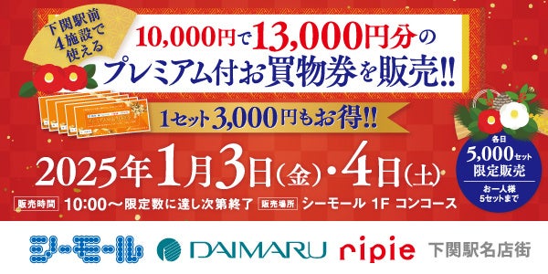 下関駅前4施設(大丸下関店・シーモール・リピエ・)で使える、10,000円で13,000円分のプレミアム付お買物券を販売!!