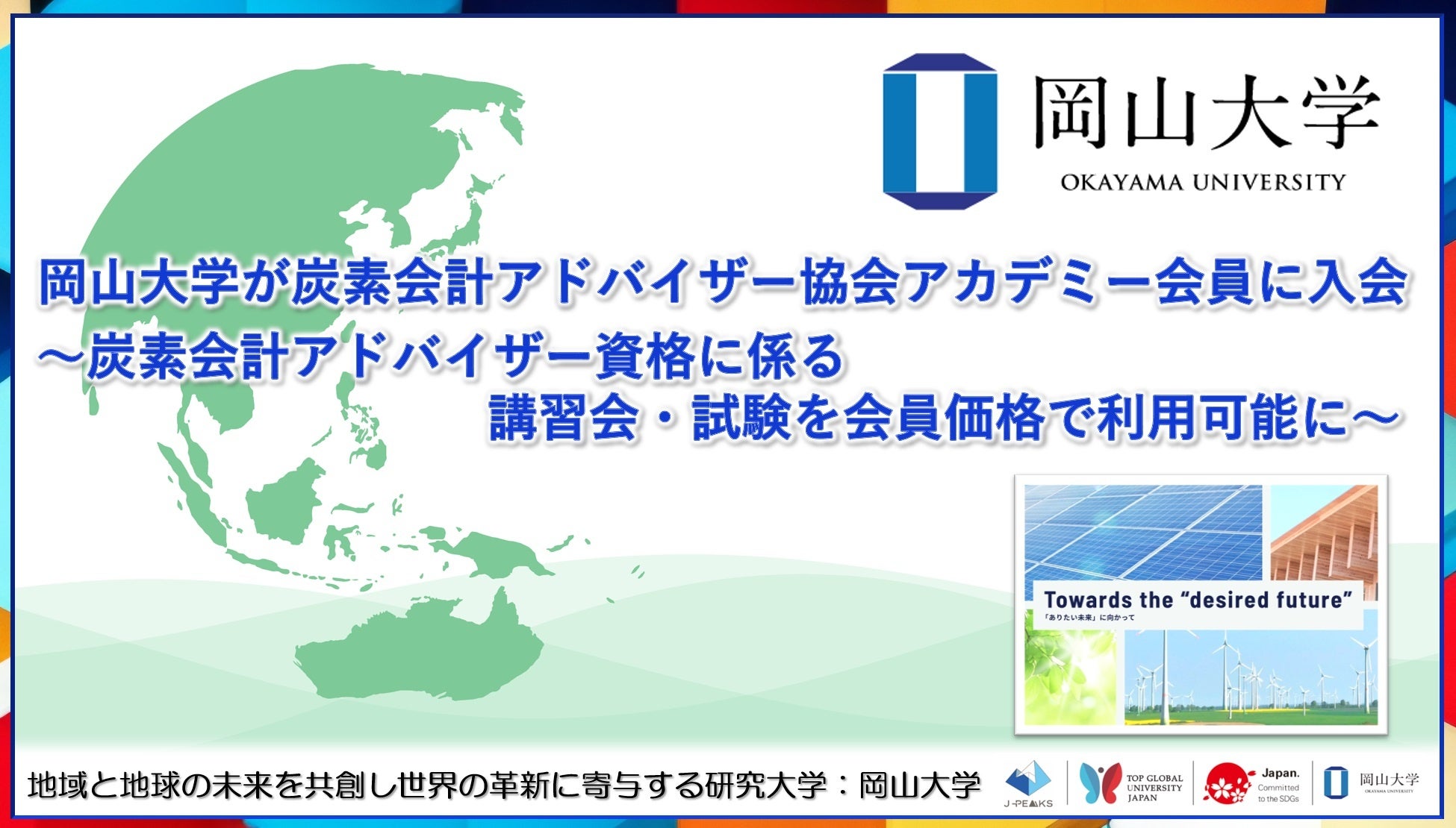 国立大学法人岡山大学(本部:岡山市北区、学長:那須保友)は2024年12月2日、一般社団法人炭素会計アドバイザー協会が募集する「アカデミー会員」に入会登録しました。