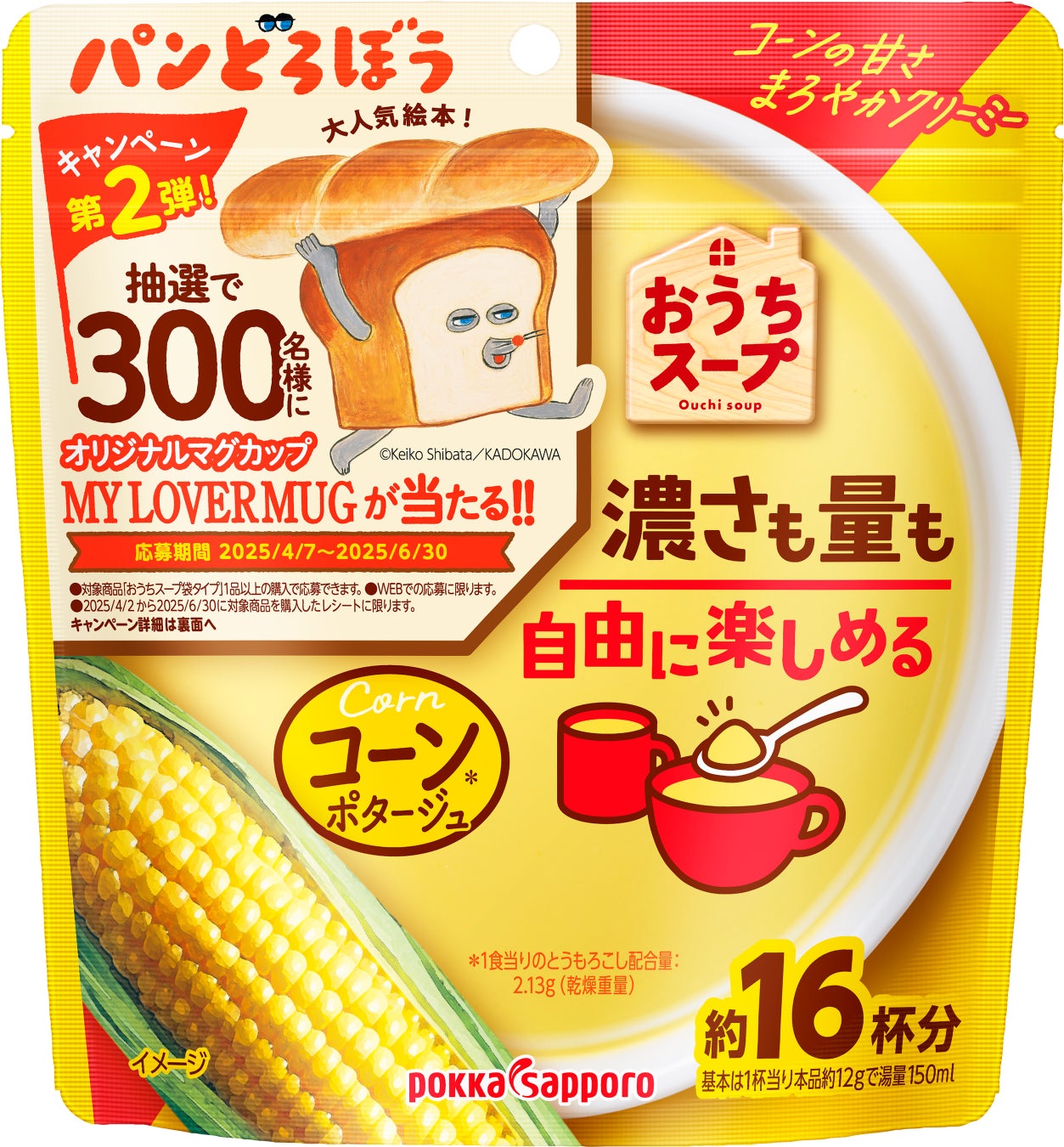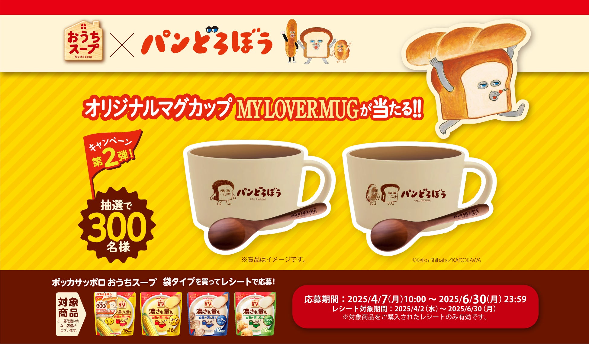 サッポロホールディングス(株)のグループ企業であるポッカサッポロフード&ビバレッジ株式会社(社長:佐藤雅志、本社:愛知県名古屋市)が展開する粉末スープブランド「おうちスープ」は、2025年4月7日(月)10:00より大人気絵本「パンどろぼう」とのコラボレーションを実施。対象商品のおうちスープ袋タイプを購入いただくと、パンどろぼうオリジナルMY LOVER MUGとスプーンのセット(マグカップ2個、スプーン2本)が抽選で300名様に当たるキャンペーン第2弾を展開します。※WEB応募限定