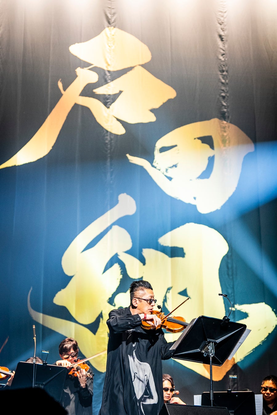 南スタンドに腰をおろすと、ステージが眼前に広がる。左右に置かれた巨大スクリーン、バックに掲げられた武田双雲の筆による「石田組」のロゴ、それに数え切れないほどの照明が仕込んであるようだ。武道館というハコに真っ向から挑むような舞台の構えに期待が一気に膨らむ。開演時刻になると客電が落ち、歓声が上がる。紫色の灯りの中に登場した出演者陣(組員)が低くイントロを刻み始める。「BATTLE WITHOUT HONOR OR HUMANITY」(布袋寅泰)だ。やおらステージ中央に後光が差すと、ゆっくりと石田泰尚が登場。組員は全員サングラスを着けている。のっけからこれほど歌舞くとは!呆気にとられている内に、コンサートは「天国への階段」(レッド・ツェッペリン)、「スターゲイザー」(レインボー)と70年代ハードロックのレパートリーが続く。そういえばこの日取り上げられたバンドは、後半のU.K.を除けば皆武道館でのライブを行なっている。「天国への階段」では照明の演出により教会でカンタータを聴いているような雰囲気を作っていく。ジミー・ペイジのあのギターソロは辻本玲(チェロ)、中村洋乃理(ヴィオラ)、佐久間聡一(第1ヴァイオリン)、双紙正哉(第2ヴァイオリン)のトップ奏者によるソロで繋ぐ。石田組は音楽を通して各メンバーにスポットを当てていくのが本当にうまい。「スターゲイザー」ではディストーションや太い音圧がPAを通してしっかりと響く。ケルト〜中東という流れに続いて、「亡き王女のためのパヴァーヌ」(ラヴェル)、「火祭りの踊り」(ファリャ)、「ファランドール」(ビゼー)と、クラシックナンバーを通じてエキゾチックな雰囲気が会場を覆う。「ファランドール」はこの日最初のピークを刻んだ。