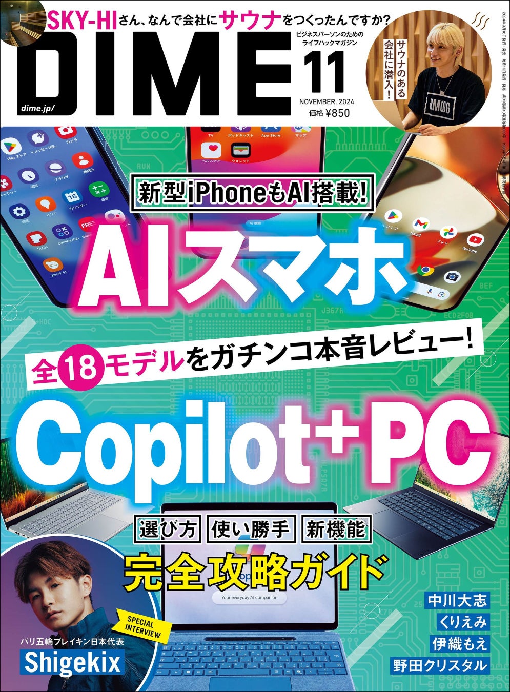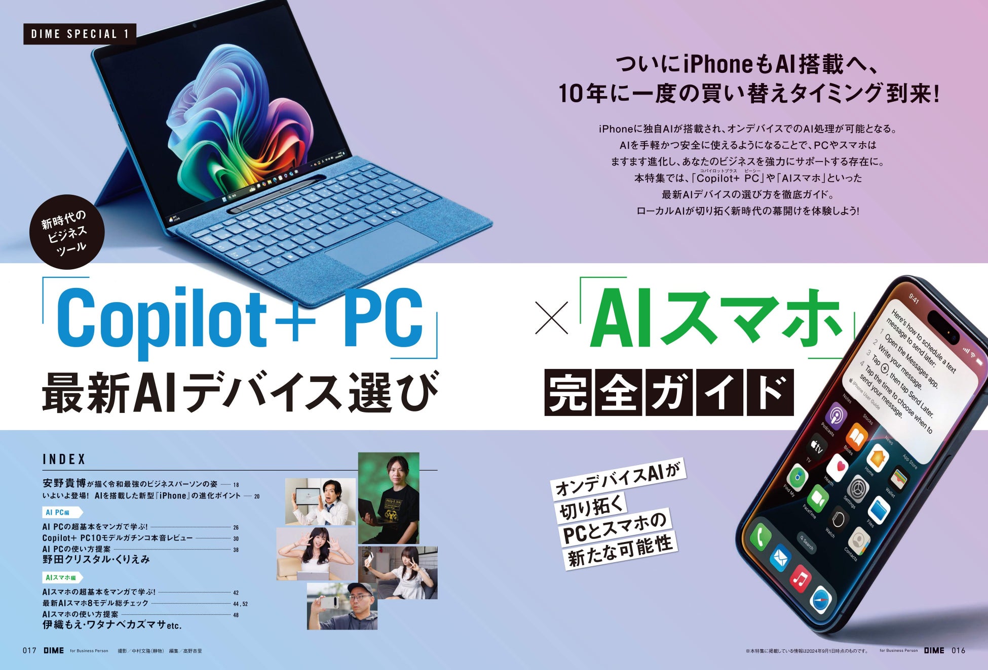 新たに発表されたiPhone 16に独自AI「Apple Intelligence」が搭載され、オンデバイスAI時代がついに本格化します。まさにPCやスマホは10年に一度の買い時といってもいいでしょう。そこで、今月のDIMEでは「Copilot+ PC」や「AI スマホ」といった最新AIデバイスの選び方、活用法、新機能などを完全ガイド。