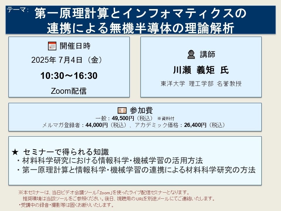 先端技術情報や市場情報を提供している(株)シーエムシー・リサーチ(千代田区神田錦町: https://cmcre.com/ )では、 各種材料・化学品などの市場動向・技術動向のセミナーや書籍発行を行っておりますが、 このたび「第一原理計算とインフォマティクスの連携による無機半導体の理論解析」と題するセミナーを、 講師に野田 祐輔 氏 (九州工業大学 大学院情報工学研究院 物理情報工学研究系 准教授)をお迎えし、2025年7月4日(金)10:30より、 ZOOMを利用したライブ配信で開催いたします。 受講料は、 一般:49,500円(税込)、 弊社メルマガ会員:44,000円(税込)、 アカデミック価格は26,400円(税込)となっております(資料付)。