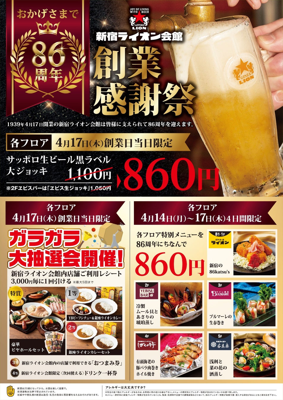 新宿でビールを楽しむなら『新宿ライオン会館』86周年記念の感謝祭イベントを4/14~4/17に開催