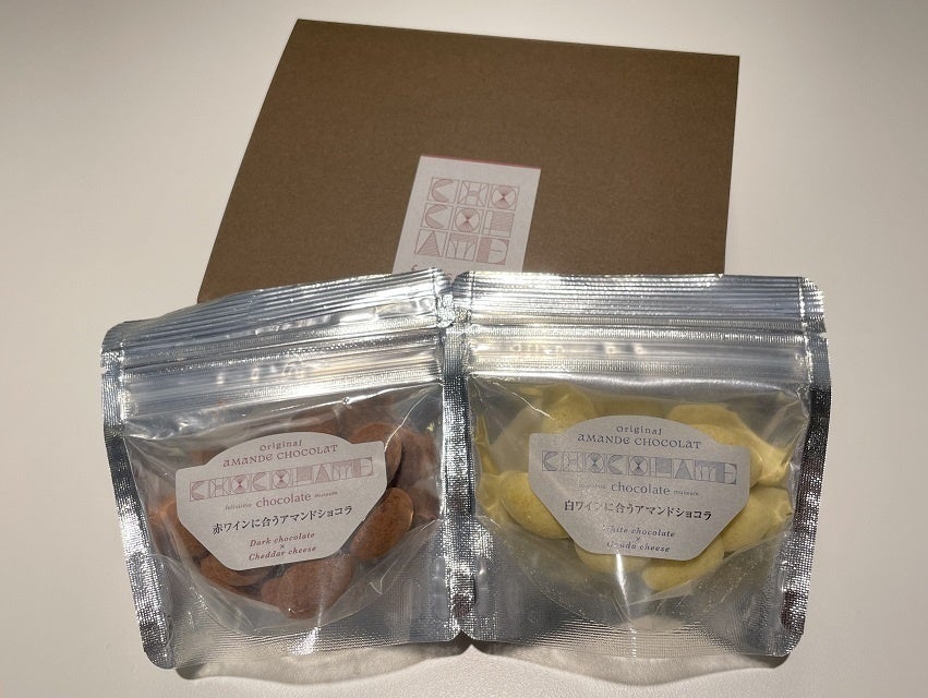 味わいは2種類。ダークチョコにコクと酸味が絶妙なチェダーチーズパウダーを混ぜ込み、深くローストしたビターなアーモンドにコーティング。表面にはブラックペッパーパウダーをまぶしてアクセントを効かせ、赤ワインとよく合うアマンドショコラです。もうひとつは、ホワイトチョコに北海道産ゴーダチーズを贅沢に混ぜ込みキャラメリゼした香ばしいアーモンドをコーティング。表面にまぶしたローズマリーパウダーとこってりとしたチョコの爽やかなハーモニーが、白ワインによく合います。「f winery」のワインに合わせても楽しめるようにと、オリジナルレシピで仕上げたfelissimo chocolate museumだけで購入できるチョコレートです。2つのフレーバーはそれぞれ個装のチャック付きパッケージ入りなので、ちょっとしたギフトにも使えます。数量限定で、felissimo chocolate museum内のチケット無しで利用できるショップスペース「museum holic[ミュージアム ホリック]」で購入できます。