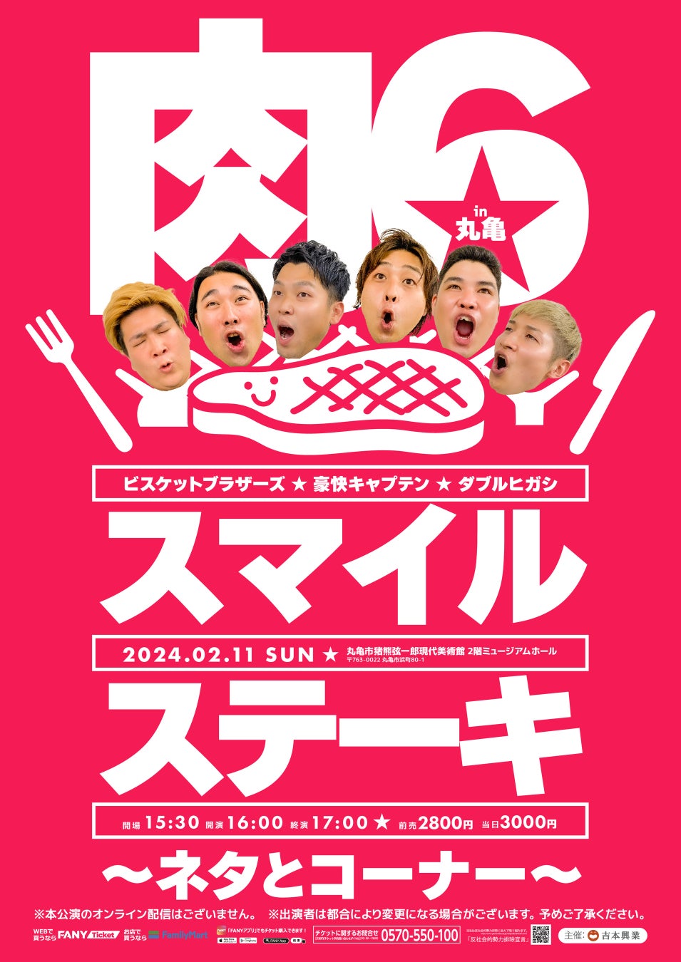 2月10日、豪快キャプテン・べーやんの出身地、広島県広島市にあるゲバントホールにて「肉6ピクニックパーティーin広島」を開催し、翌日2月10日、ビスケットブラザーズ・きんの出身地香川県丸亀市にある丸亀市猪熊弦一郎現代美術館2階ミュージアムホールにて「肉6スマイルステーキin丸亀」を開催いたします。