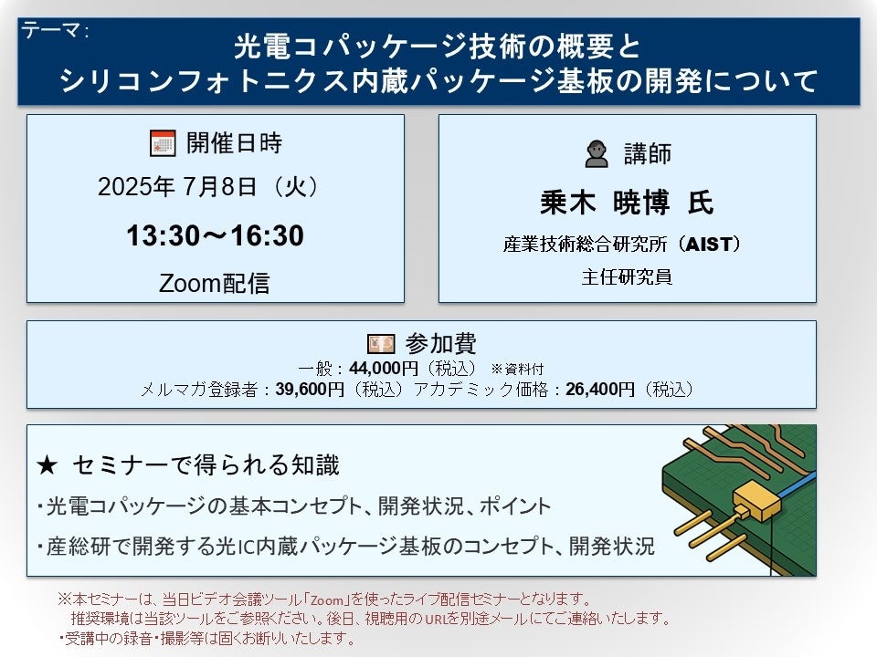 先端技術情報や市場情報を提供している(株)シーエムシー・リサーチ(千代田区神田錦町: https://cmcre.com/ )では、 各種材料・化学品などの市場動向・技術動向のセミナーや書籍発行を行っておりますが、 このたび「光電コパッケージ技術の概要とシリコンフォトニクス内蔵パッケージ基板の開発について」と題するセミナーを、 講師に乗木 暁博 氏(産業技術総合研究所 主任研究員)をお迎えし、2025年7月8日(火)13:30より、 ZOOMを利用したライブ配信で開催いたします。 受講料は、 一般:44,000円(税込)、 弊社メルマガ会員:39,600円(税込)、 アカデミック価格は26,400円(税込)となっております(資料付)。