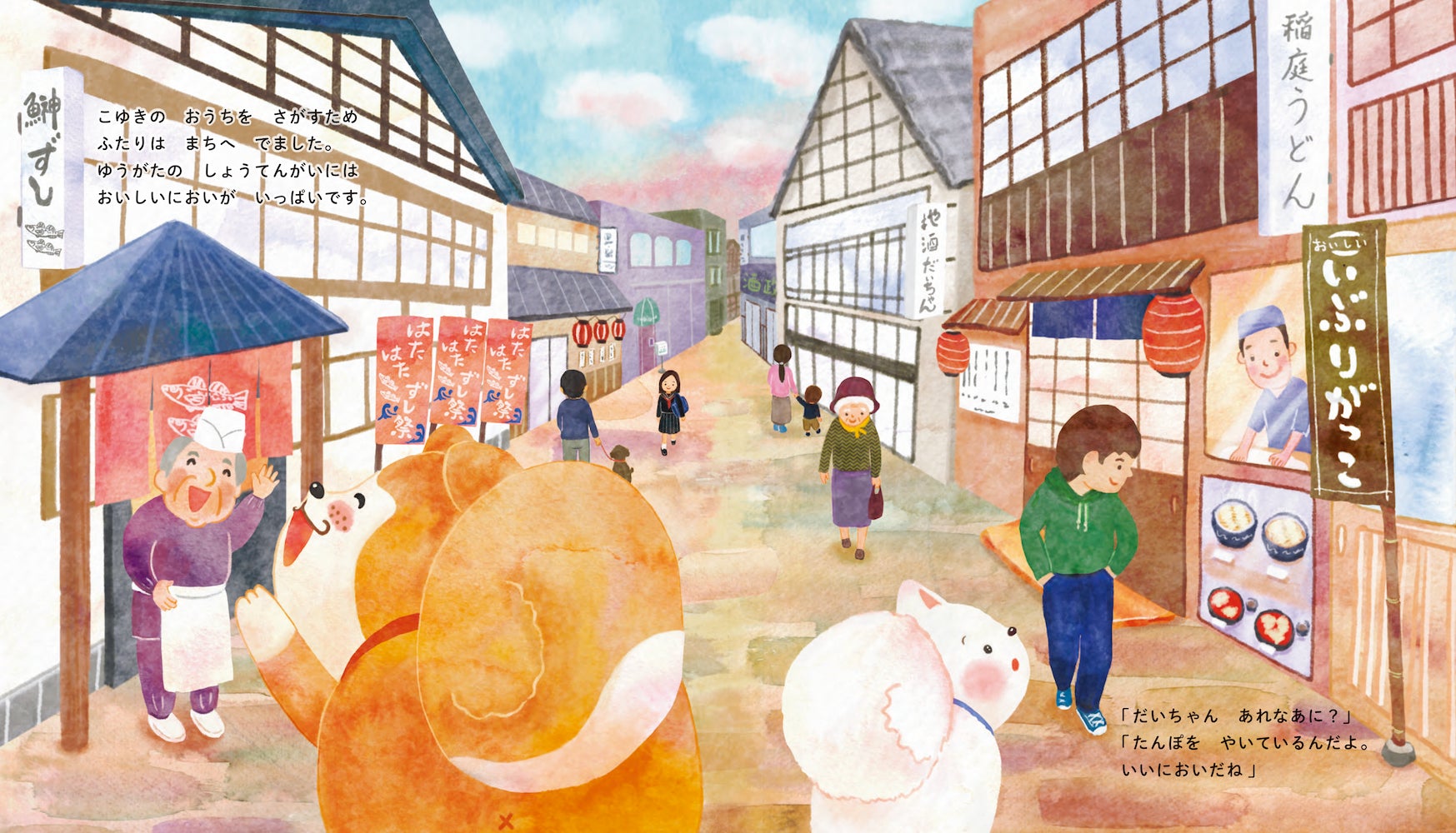 商店街の人や子どもたちとの出会いの中で、子犬は元気を取り戻していきます。