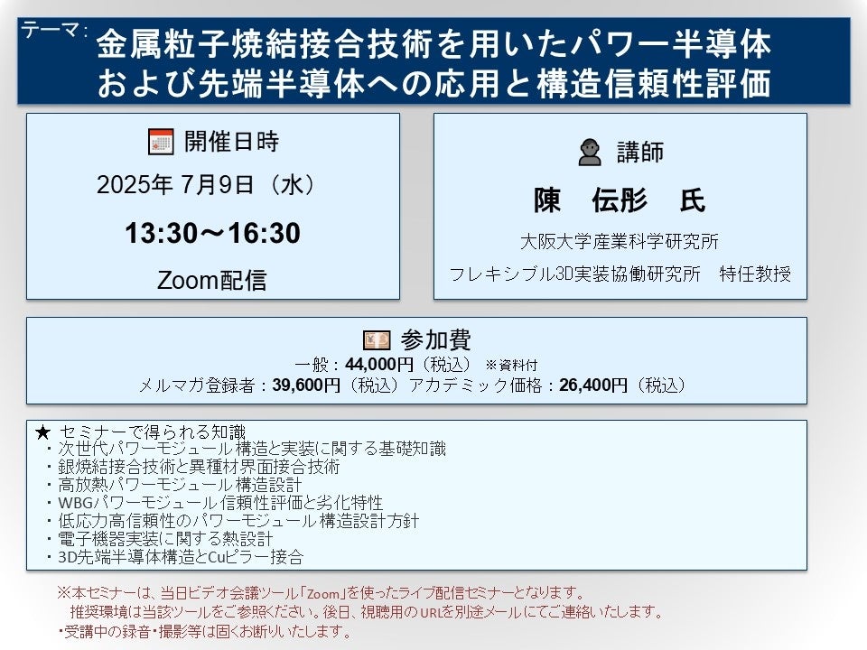 先端技術情報や市場情報を提供している(株)シーエムシー・リサーチ(千代田区神田錦町: https://cmcre.com/ )では、 各種材料・化学品などの市場動向・技術動向のセミナーや書籍発行を行っておりますが、 このたび「金属粒子焼結接合技術を用いたパワー半導体および先端半導体への応用と構造信頼性評価」と題するセミナーを、 講師に陳 伝彤 氏 (大阪大学産業科学研究所 フレキシブル3D実装協働研究所 特任教授)をお迎えし、2025年7月9日(水)13:30より、 ZOOMを利用したライブ配信で開催いたします。 受講料は、 一般:44,000円(税込)、 弊社メルマガ会員:39,600円(税込)、 アカデミック価格は26,400円(税込)となっております(資料付)。
