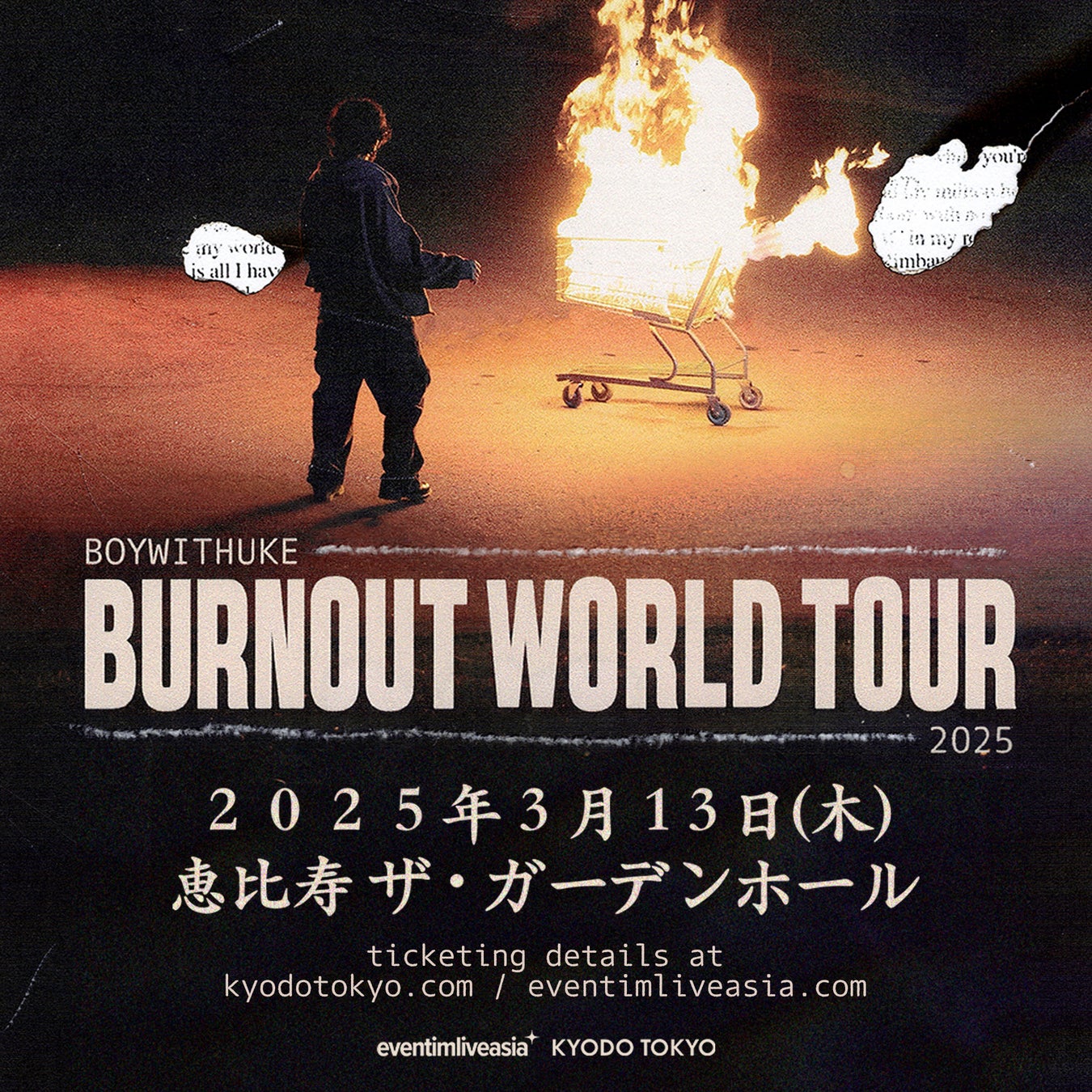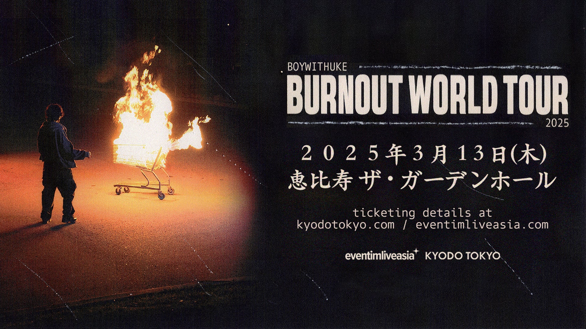 ウクレレを持ち仮面を被って歌う姿で知られるBOYWITHUKEことチャーリー・ヤンが、遂に仮面を外しBOYWITHUKE名義での最後の作品となるアルバム『Burnout』と共に2年ぶりの来日公演を開催することが 決定!2020年にTikTokで「Minute Long Song」がヒットし15億回近くのストリーミングを記録、その後リリースしたシングル「Toxic」はプラチナ認定を受け一躍ブレイクを果たす。2022年5月にはメジャー・デビューアルバム 『Serotonin Dreams』を発表し、ここ日本でもSpotify Japanの週間バイラルチャートで2週連続1位を獲得している。そしてこの一連のブレイクを経て、自身のアイデンティティとより深く向き合うこととなった BOYWITHUKEはこれまで彼のトレードマークとなっていた仮面とウクレレを手放し、アーティストとしての 変貌を示した最新作『Burnout』をリリースした。本作には聴き手の成⻑や変化を促す助けとなりたい、という気持ちが込められており、現在22歳のBOYWITHUKEが約1年に渡って音楽、ライブ、そして“BOYWITHUKE” と“チャーリー・ヤン”としてのバランスをネクスト・レベルへと昇華させた集大成となっている。一人の個人、そしてアーティストとして大きな進化を遂げ、新たな扉を開いたBOYWITHUKEの貴重なパフォーマンスをお見逃しなく!