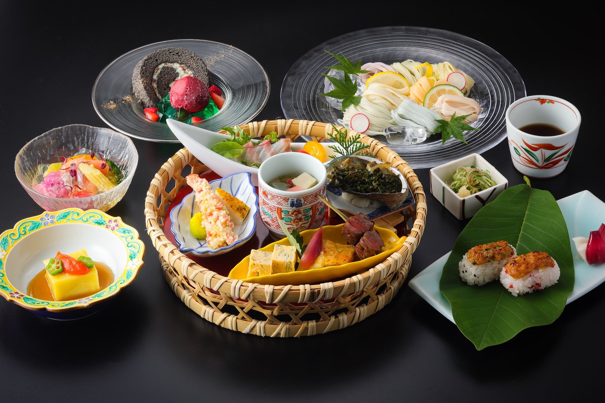 献立には映画のシーンでも登場するメニューを一部ご用意。白米に梅とごま塩をそれぞれ混ぜた「作中に登場する朴葉味噌のおにぎり」や、かごに盛られた色鮮やかな10種類の旬菜、デザートの「情念渦巻くロールケーキ 美麗なシャーベットを添えて」など、モノノ怪の世界観を見て・食べて楽しめるボリューム満点のラインアップです。