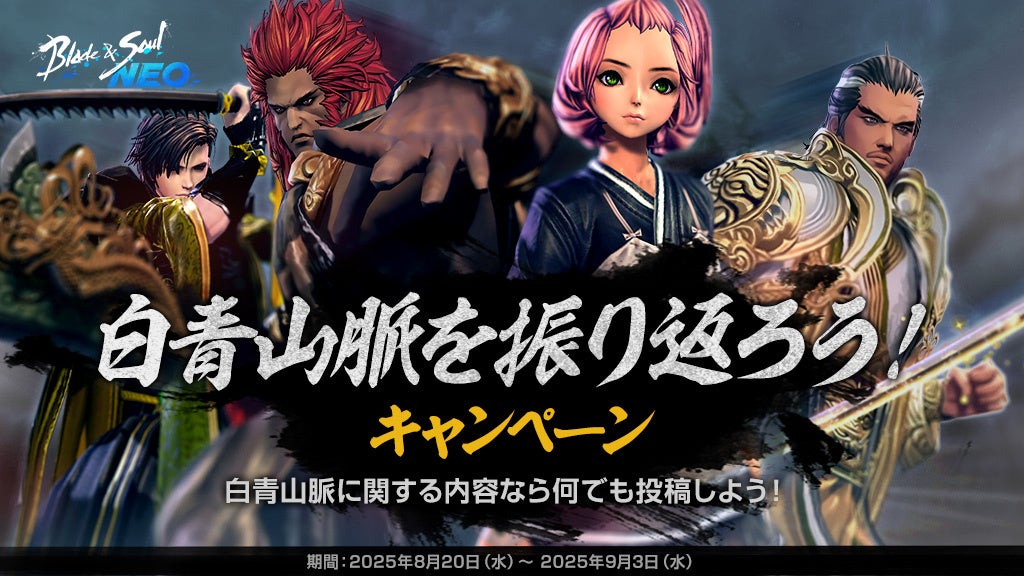 『ブレイドアンドソウル』でお馴染みの「白青山脈」の、『ブレイドアンドソウルNEO』に登場を記念して「白青山脈を振り返ろう!キャンペーン」を開始します。