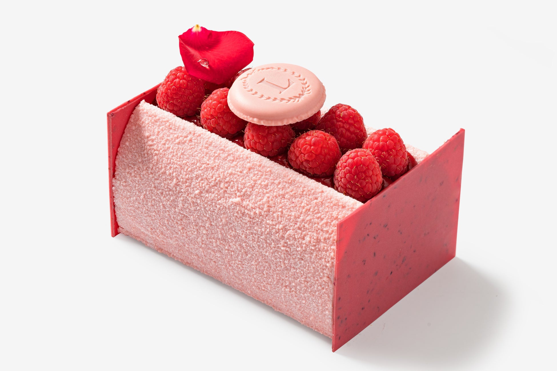 ローズとフランボワーズのクルスティヨンにビスキュイ・ジョコンド、フランボワーズとライチのコンフィ、バラが香るシャンティ・マスカルポーネを重ね、フランボワーズとローズ・ペタル、ウジェニー・ローズのデコレーション。サイドにはローズとフランボワーズが香る板チョコレート。ラデュレを象徴するフレーバー、「ローズ」、「フランボワーズ」、「ライチ」が織りなす、美しいハーモニー。