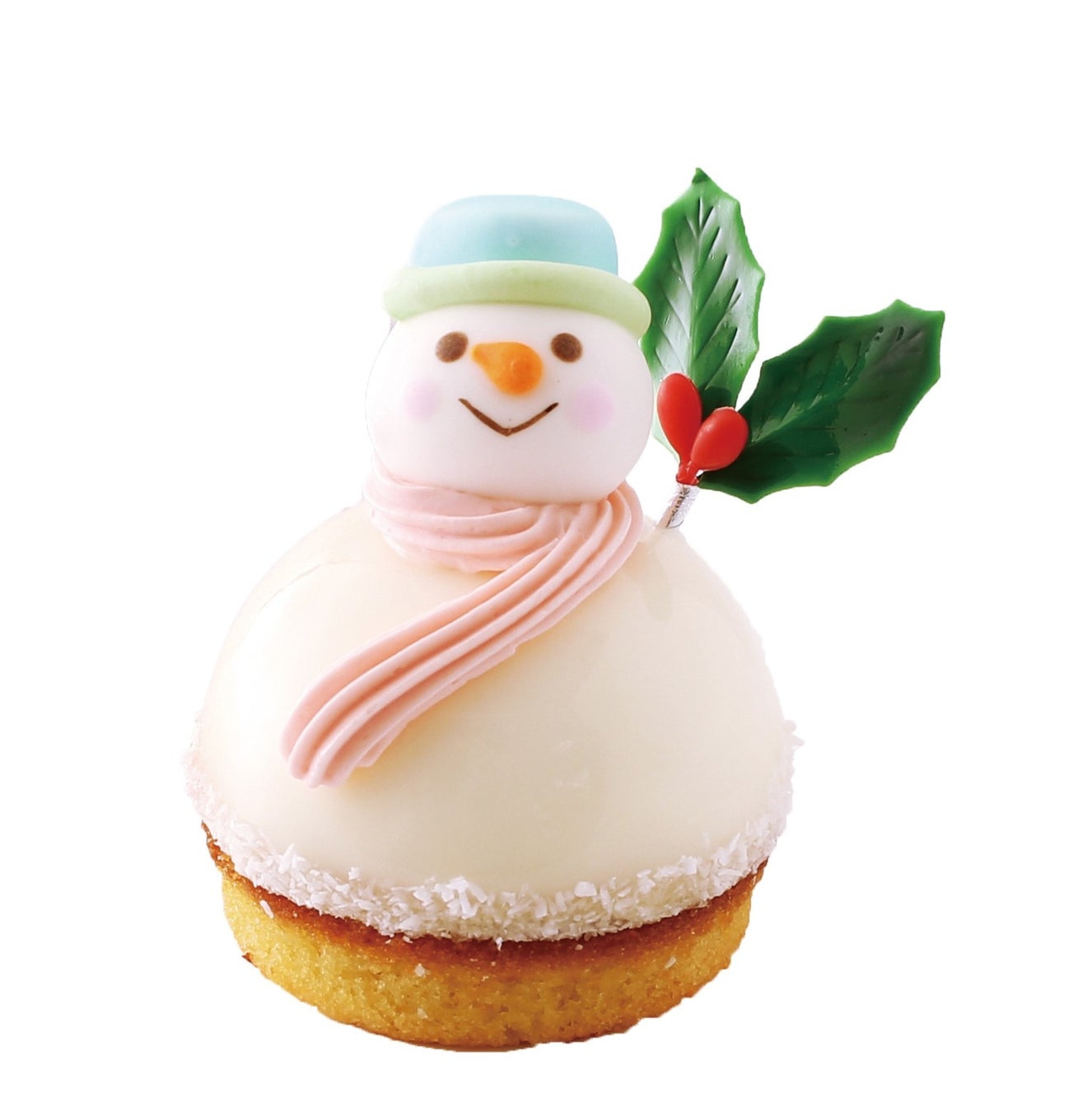 左:さわやかなオレンジのクリームを包んだレアチーズケーキのスノーマン。アーモンドケーキにのせて。