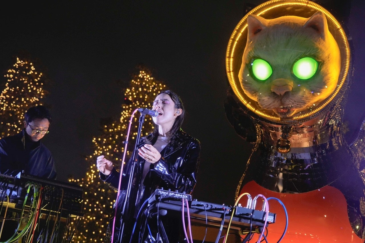 まずはシンガーソングライター・プロデューサー ・DJとして幅広く活躍するMaika Loubtéが登場し、電子音楽に透明感のある伸びやかな歌声をのせてパフォーマンスを披露。夜空の下でのイベントにふさわしいしっとりした楽曲からクリスマスシーズンにぴったりな幻想的な雰囲気の曲、アップテンポなポップチューンまで「You and I 」や「Melody Of Your Heart」など多彩な7曲を披露した。様々な音を作り出す電子楽器を使用したパフォーマンスは目にも耳にも楽しく、アートオブジェも相まって未来感のあるステージに観客もワクワクした様子で耳を傾ける。クラブミュージックを思わせるナンバーでは自由にノリながらステージを楽しんでいた。