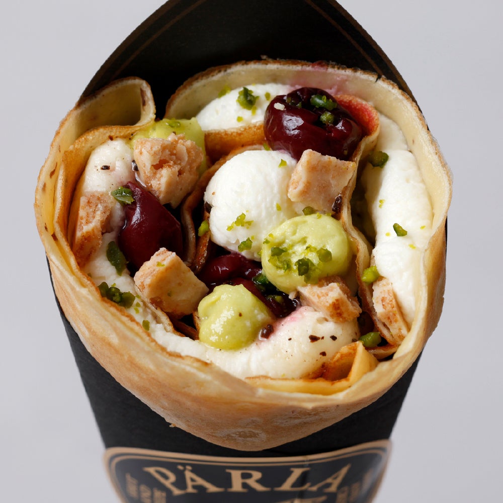 クレープとお酒のマリアージュが楽しめるハイエンドなクレープスタンド。ピスタチオとマスカルポーネのクリームに、グリオットチェリーの酸味が絶妙にマッチ。ホワイトチョコクランチが食感のアクセントに。