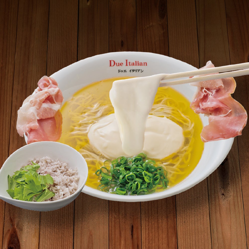 人気No.1メニュー。鶏ベースのあっさり塩らぁ麺に、シェフ特製とろ~り濃厚チーズと生ハムをトッピング。イタリアンとらぁ麺を融合した、新しいらぁ麺のかたち。あまりかき混ぜず、麺とチーズを絡めながらどうぞ。あの石塚和生シェフも会場に登場予定。