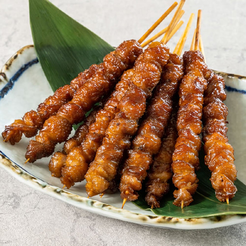 皮下脂肪の少ない首の皮だけを、独特の製法で丁寧に巻き上げ、仕込みに5日間。焼いては寝かせを繰り返し、外はカリッ、中はジューシーに。