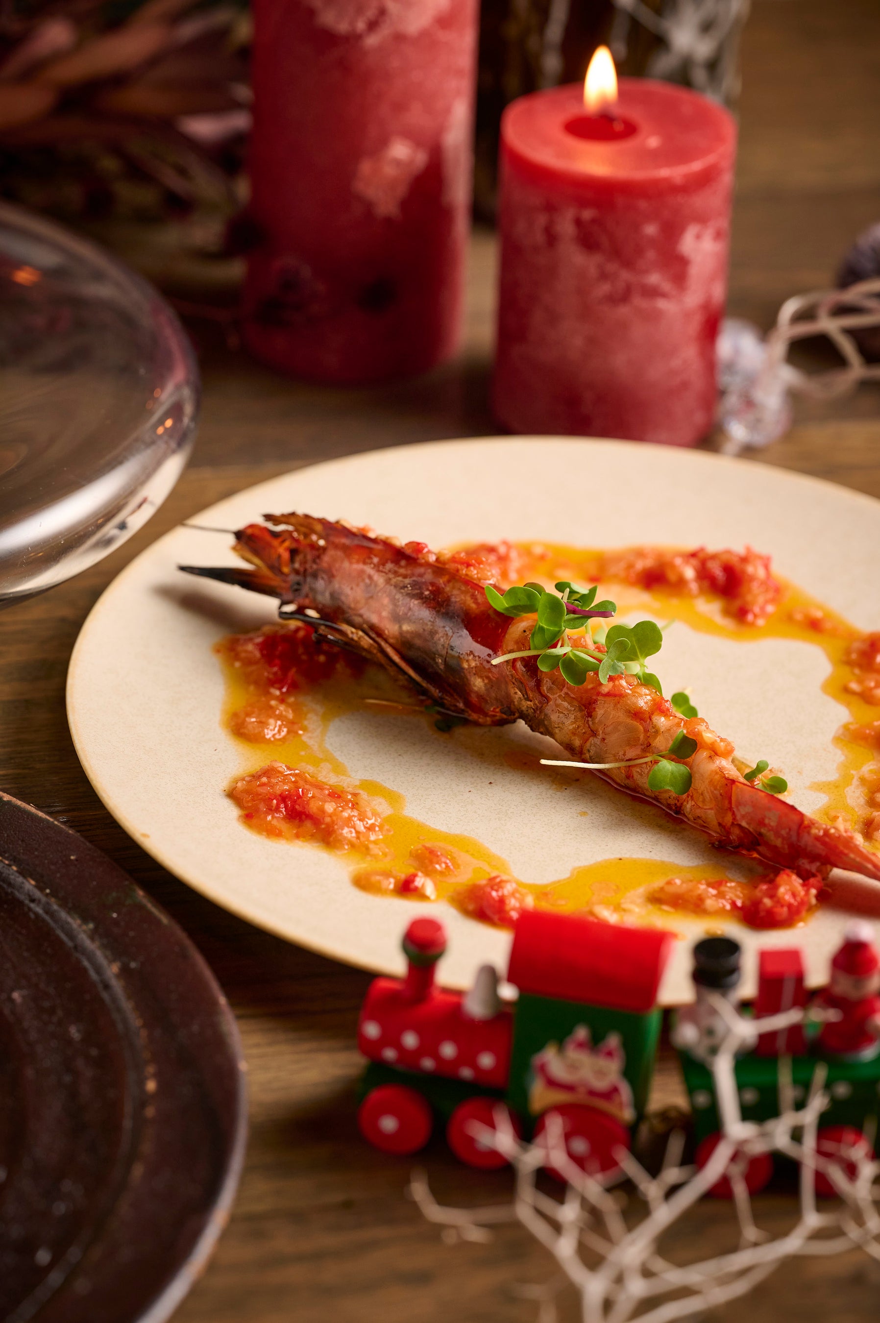 炭⽕で丁寧に焼き上げた⼀本の海⽼をガーリックシュリンプに⾒⽴てた、シェフの独創性溢れる⼀⽫。ナンプラーを使⽤したソースを合わせ、エスニックなニュアンスで仕上げています。