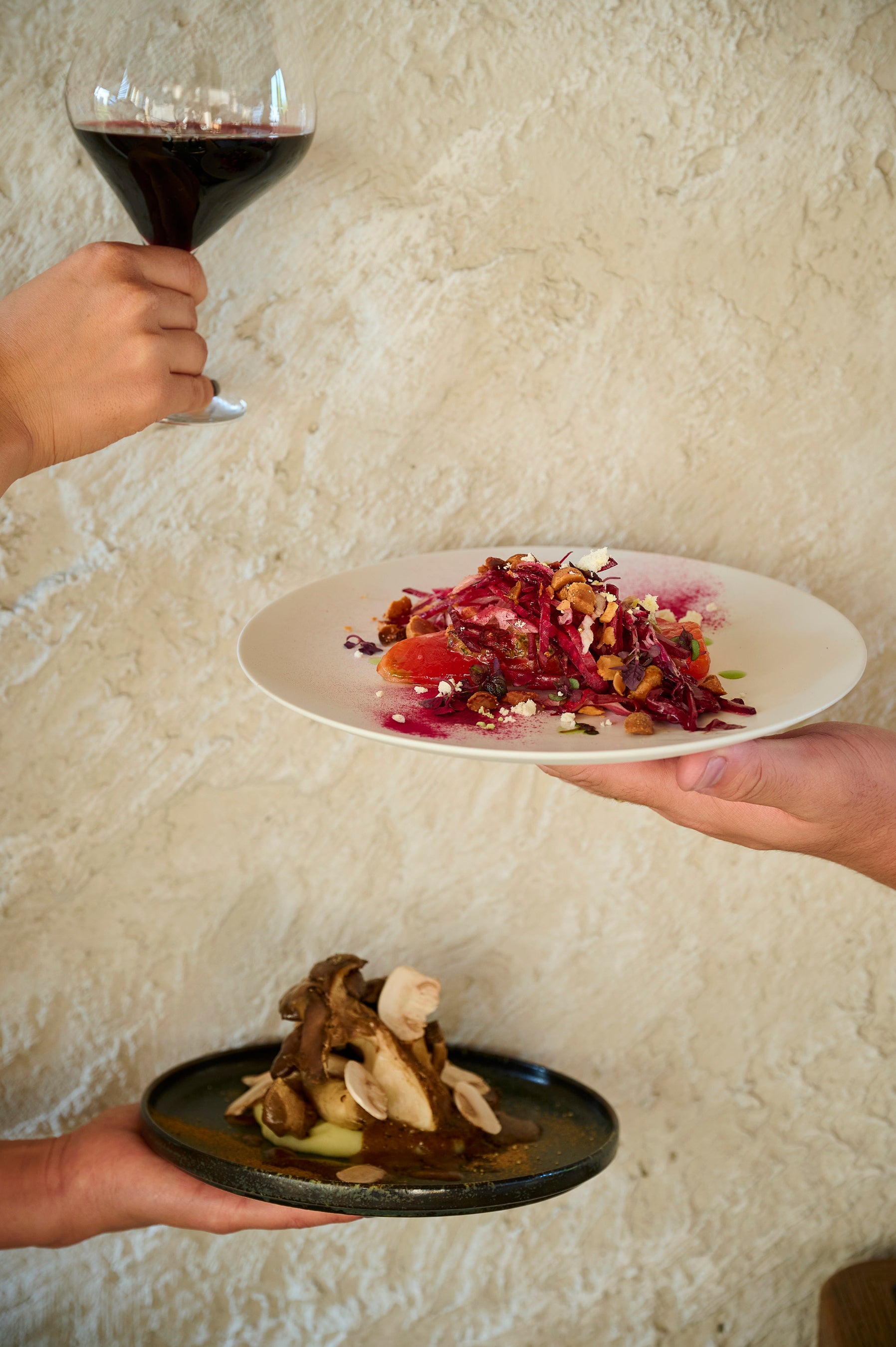 クリスマス連想させるルビーカラーを効かせた一⽫。トレビス、ビーツ、ブッラータチーズといった具だくさんのサラダに旬のイチゴや鴨ハムをあわせ、ビネグレットで⽢酸っぱく仕上げました。