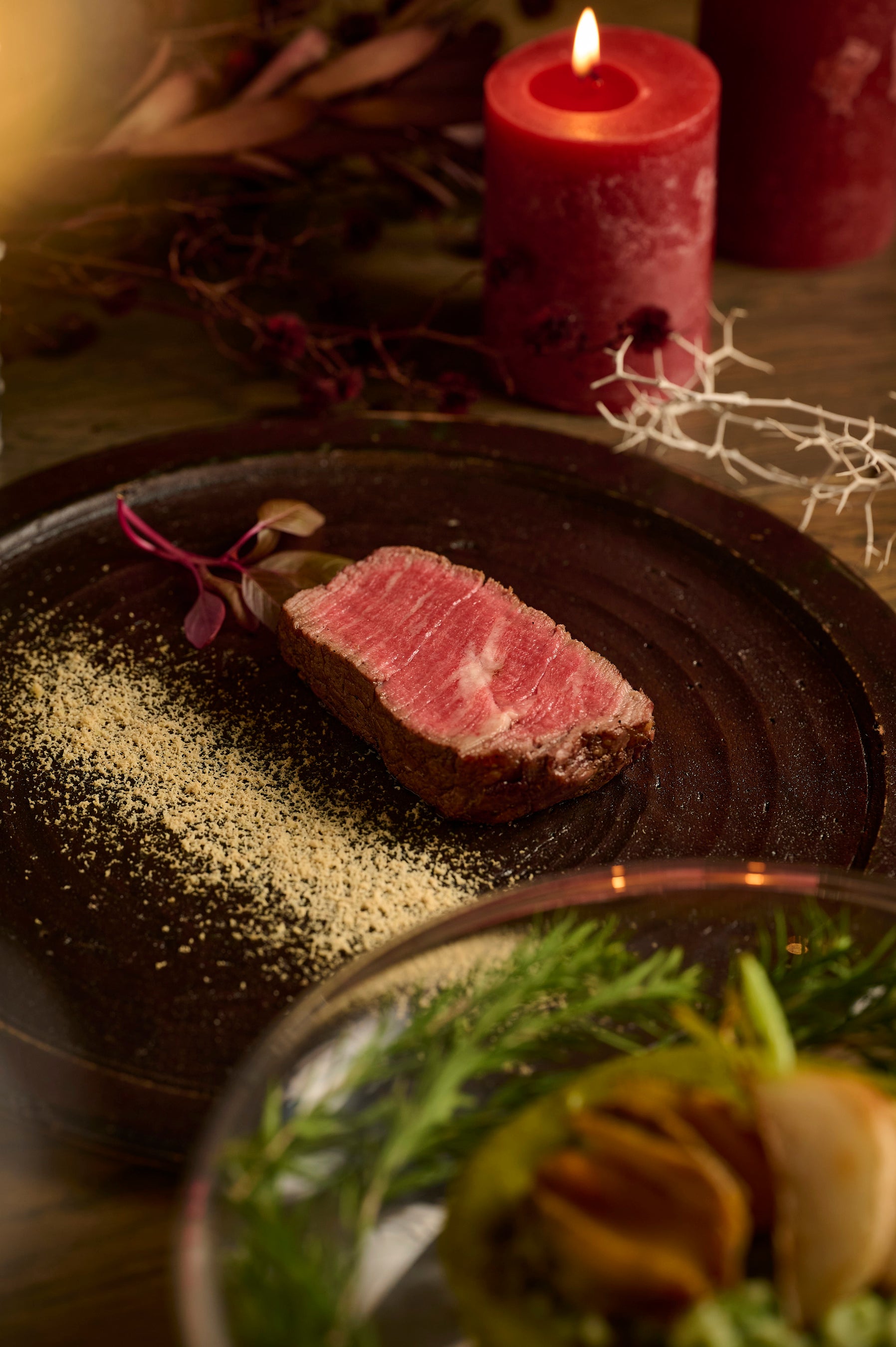 メインは薪⽕でじっくりと⽕⼊れした経産⽜のフィレ⾁。トリュフを使⽤したコクのあるソースをお好みであわせてお召し上がりください。