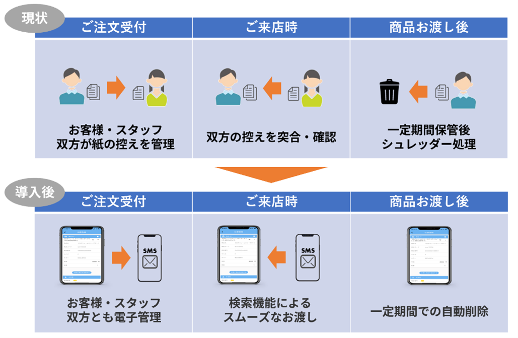 現在、マルイ店舗では、商品の取置き・取寄せ・修理に関して紙の伝票を使用しており、個人情報保護のために起票から保管、削除にいたるまで多くの作業時間がかかっています。また、紙の伝票使用枚数は年間約10万枚におよび、環境負荷も課題となっていました。