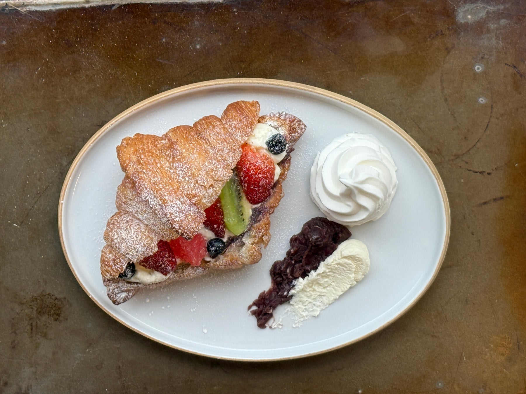 発酵バターを丁寧に折り込んだB²(ビースクエアード)のクロワッサンに、喜界島の粗糖を使った優しい味わいの自家製あんこ、マスカルポーネクリーム、フレッシュフルーツをサンド。しんむら牧場のソフトクリームを添えたスペシャルデザートです。
