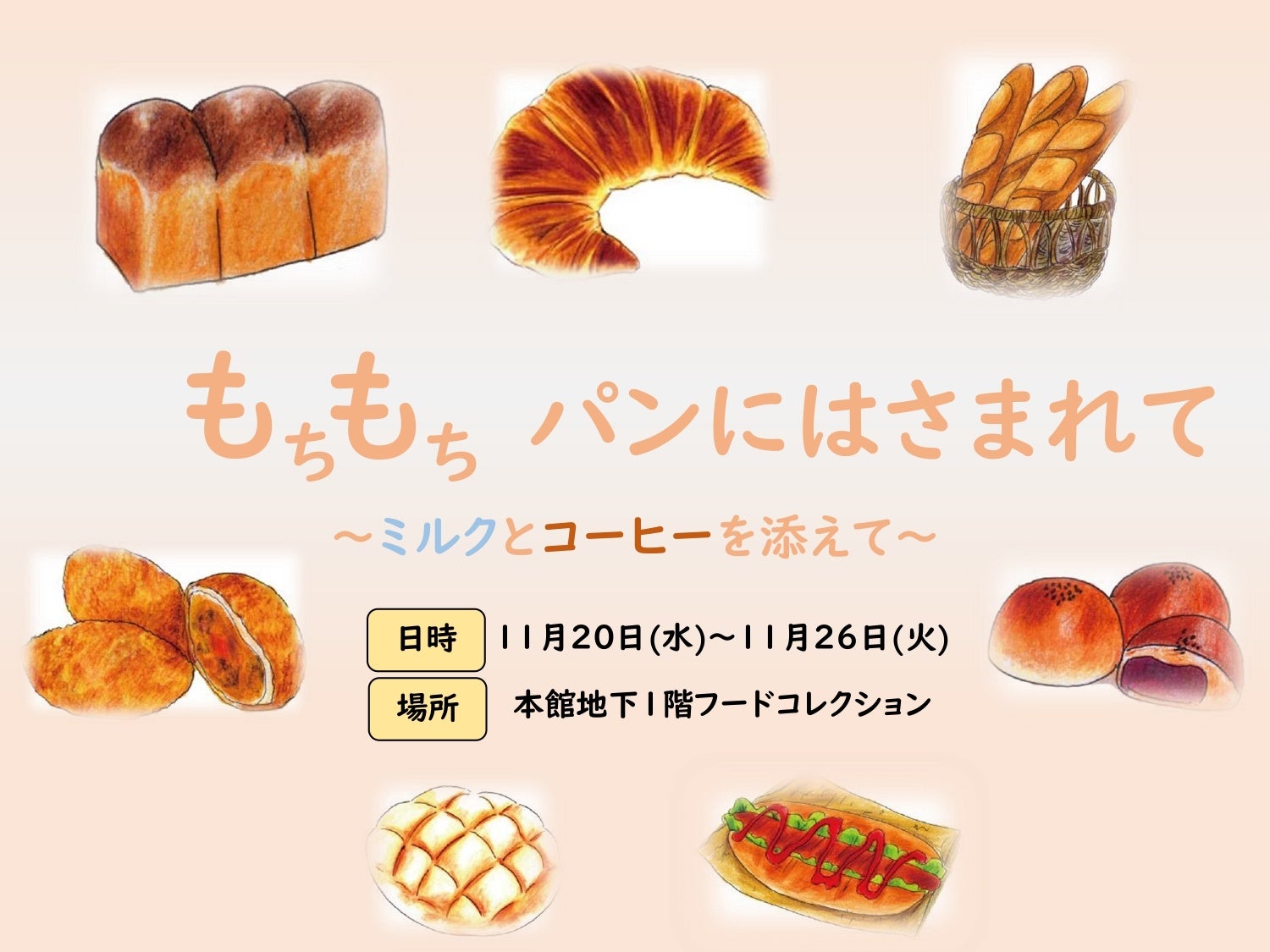 日本橋三越本店は、11月20日(水)~11月26日(火)まで、本館地下1階 フードコレクションで「もちもちパンにはさまれて ~ミルクとコーヒーを添えて~ 」を開催いたします。各地のイベントで行列のできる人気店など、全国から初出店を含む12店舗が登場。人気のパンはもちろん、パンに合わせたジャムや牛乳、コーヒーなどもご紹介する、パン好きにはたまらないイベントです。