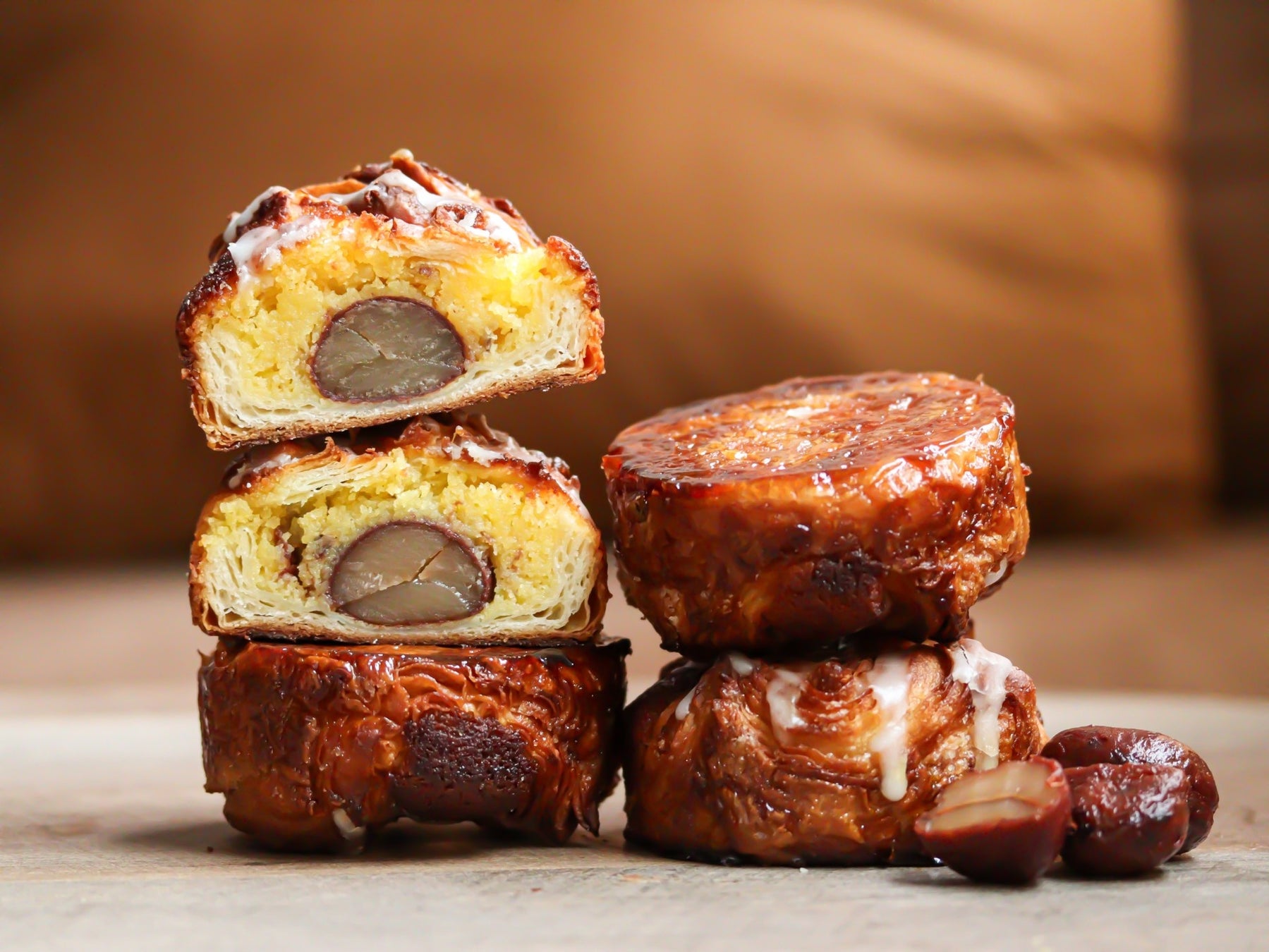 外はカリっと中はじゅわっとバターが染み出る2層の生地を使用した人気のクイニーアマンに、この会場限定で栗の渋皮煮とアーモンドクリームを詰めました。ここだけでしか味わえない特別なパンです。