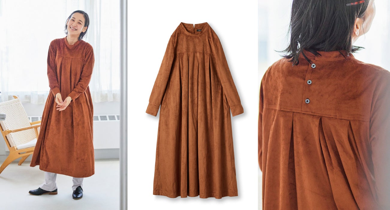 スエードのような風合いのなめらかな生地のワンピースです。切り替え下にタックが入っており、前後ともにきれいなドレープを出すことができます。