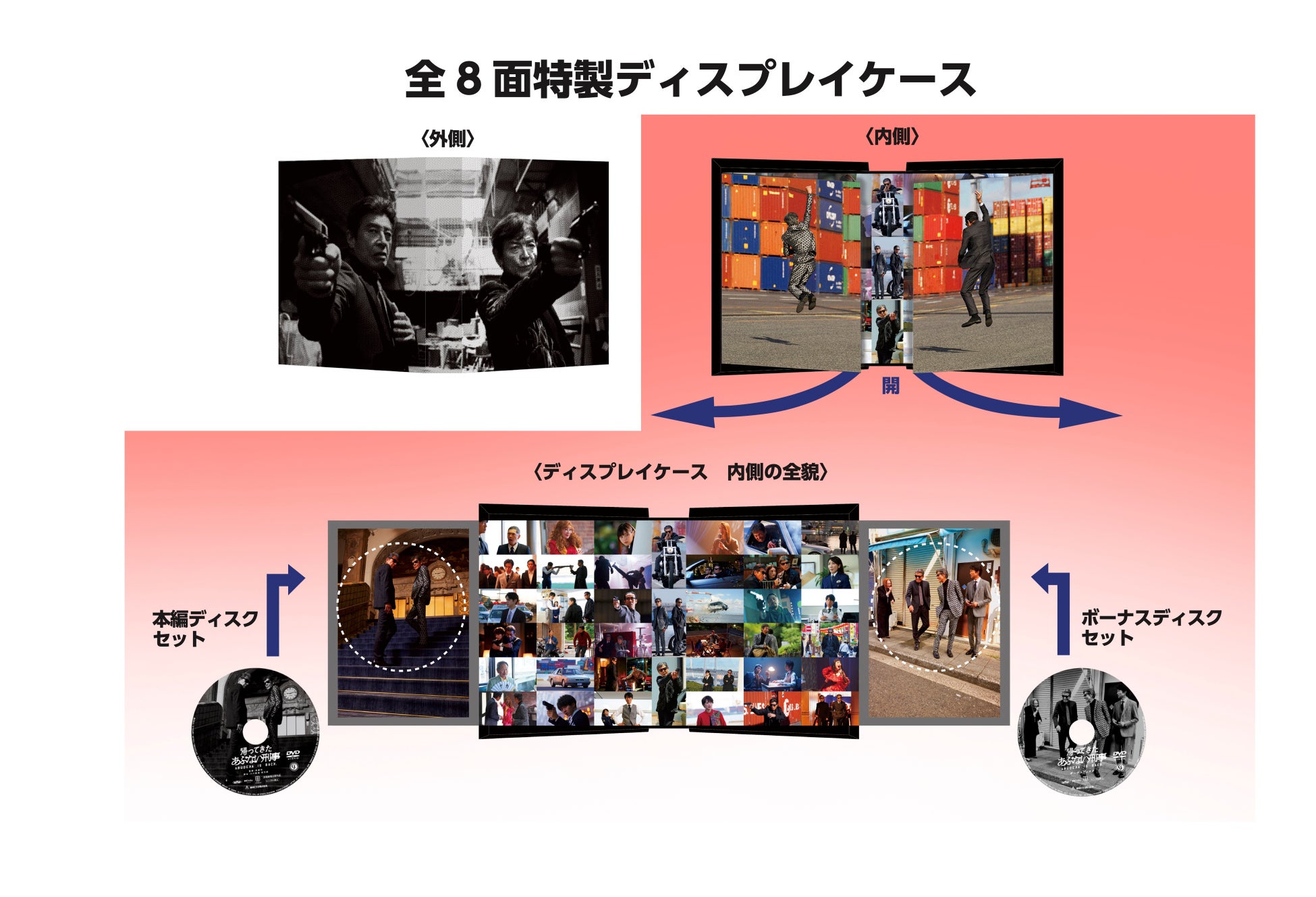 また、全8⾯特製ディスプレイケースは、タカ&ユージのビジュアルに、ディスク収納面を開くと現れる劇中シーンで構成された、飾って眺めずにはいられないスペシャル豪華ケース。