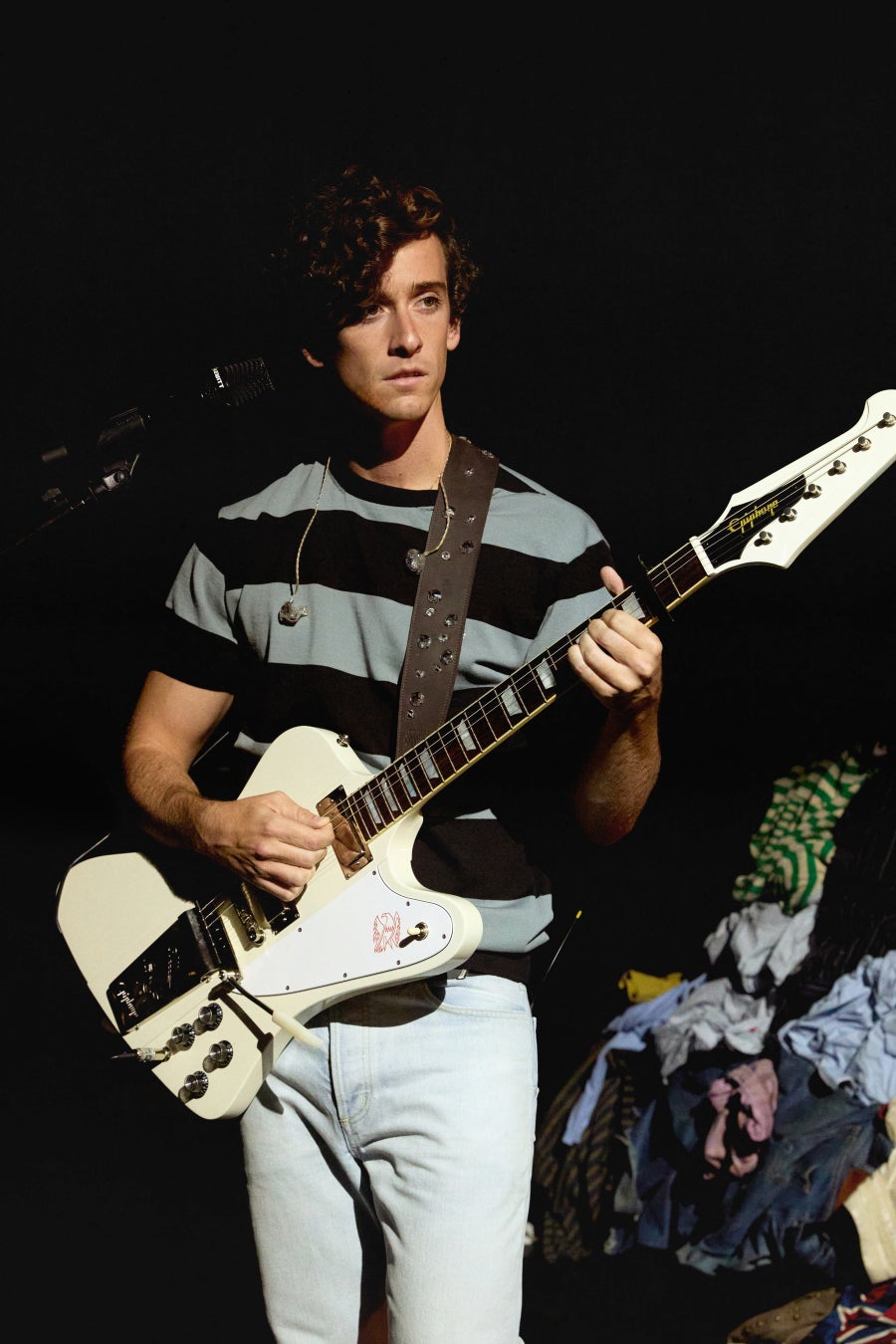 ギタリカは、ブラックとグレーのコットンストライプシャツにブルーのジーンズを合わせ、「ローディー」シューズを着用しました。