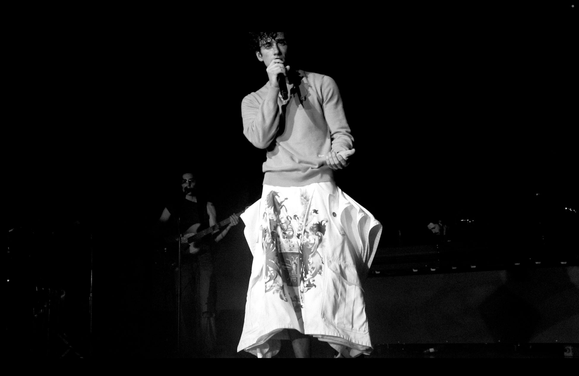 また、別のパフォーマンスでは、キャメルのウールシャツに、紋章のプリントを施したホワイトコットンデニムの「デルフト」バミューダパンツ、そしてシルバーレザーの「メダリオン」ベルトを合わせた装いで登場しました。「ローディー」シューズも着用しています。