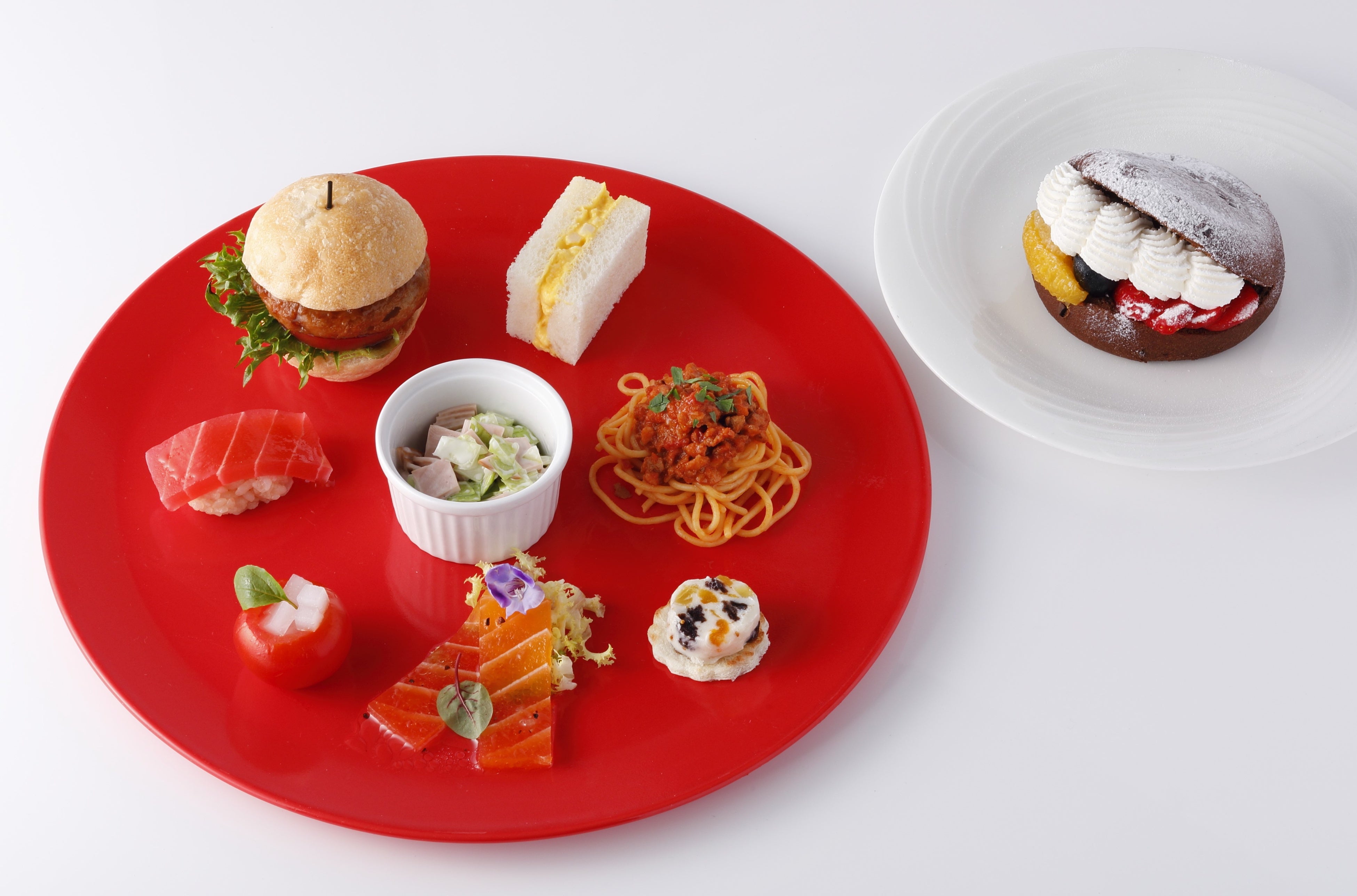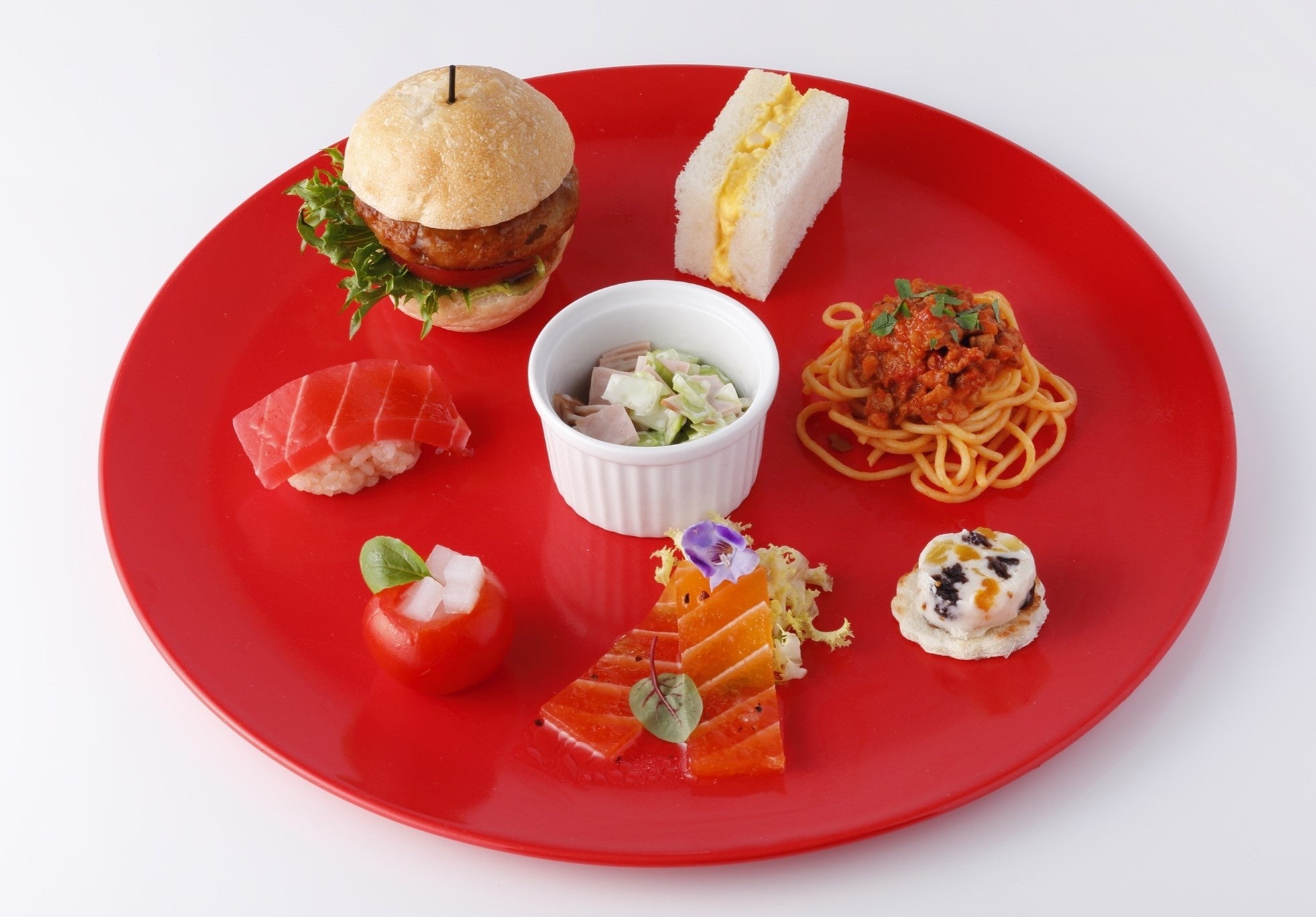 プラントベースフードを使用して一つ一つ作り上げた、ホテル特製のランチプレート。全8品からなるプレートは、子どもから大人まで人気の和・洋メニューが盛り込まれています。見た目は「タマゴサンド」や「握り寿司」そのものでも、実際は卵や魚不使用で完成された品々は、普段食べている“本物”の食材とどんな違いがあるのかなど、まずはじっくり観察してから味わいたいメニューが揃います。