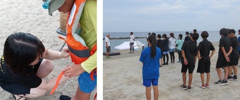 海を安全に楽しむために、アクティビティを体験する時は必ずライフジャケットを着用するように、着用方法も指導しました。またボランティア協力いただく新潟リハビリテーション大学と地域のサッカークラブ村上LachsFCの皆さんにレクチャーしてイベント開始です。