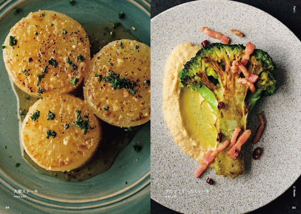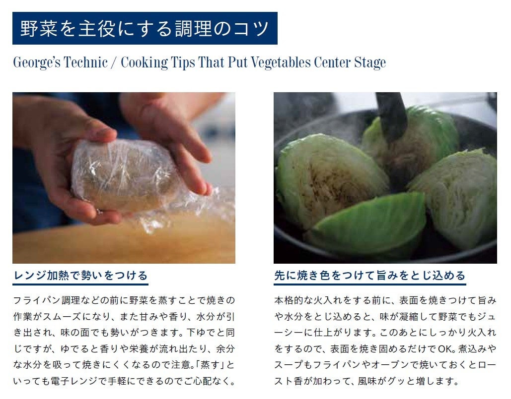 「肉や魚と比べて旨みが少ない野菜を主役にするためには、それを補う作業が必要です」と語るGeorge氏。塩を重ね、火入れを重ね、香りを重ね、二重、三重に補うことで、主役級の旨みが生まれていくーー。そんなプロの技が詰まったレシピを、大きな写真と丁寧な解説とともに紹介します。